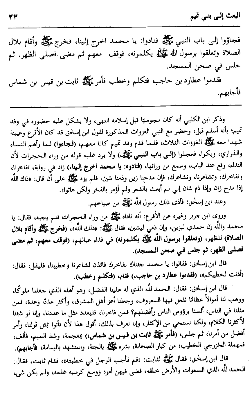 قال ابن إسحاق: فقالوا: يا محمد جئناك نفاخرك فائذن لشاعرنا وخطيبنا، فليقل، فقال: "أذنت لخطيبكم"، "فقدموا عطارد بن حاجب" فقام، "فتكلم وخطب".