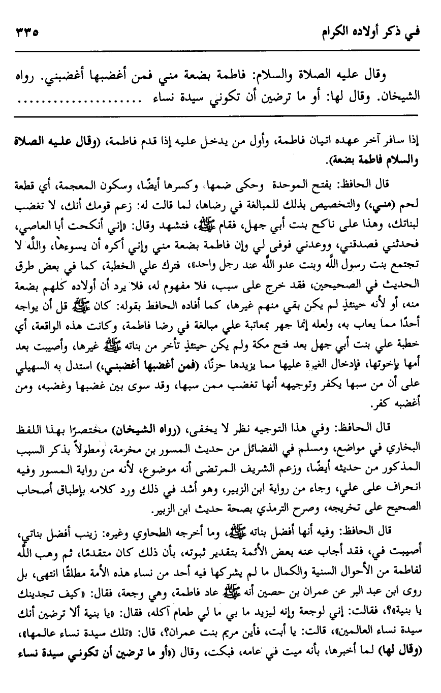 وقال عليه الصلاة والسلام: "فاطمة بضعة مني فمن أغضبها أغضبني"، رواه الشيخان. وقال لها: "أوما ترضين أن تكوني سيدة نساء