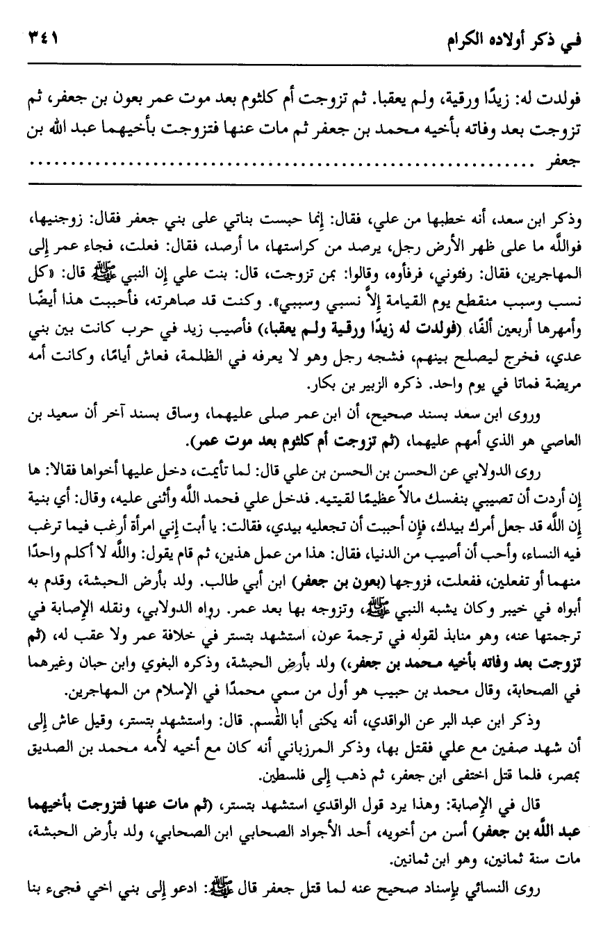 قال في الإصابة: وهذا يرد قول الواقدي استشهد بتستر، "ثم مات عنها فتزوجت بأخيهما عبد الله بن جعفر" أسن من أخويه، أحد الأجواد الصحابي ابن الصحابي، ولد بأرض الحبشة، مات سنة ثمانين، وهو ابن ثمانين.