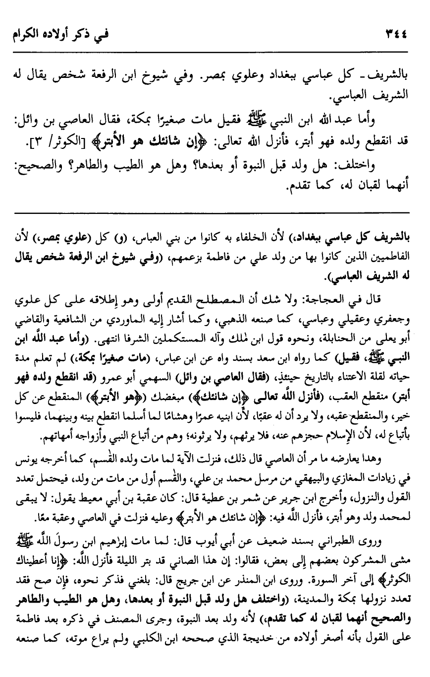 قال في العجاجة: ولا شك أن المصطلح القديم أولى وهو إطلاقه على كل علوي وجعفري وعقيلي وعباسي، كما صنعه الذهبي، وكما أشار إليه الماوردي من الشافعية والقاضي أبو يعلى من الحنابلة، ونحوه قول ابن مالك وآله المستكملين الشرفا انتهى. "وأما عبد الله ابن النبي صلى الله عليه وسلم فقيل" كما رواه ابن سعد بسند واه عن ابن عباس، "مات صغيرا بمكة"، لم تعلم مدة حياته لقلة الاعتناء بالتاريخ حينئذ، "فقال العاصي بن وائل" السهمي أبو عمرو "قد انقطع ولده فهو أبتر منقطع العقب" "فأنزل الله تعالى: {إِنَّ شَانِئَكَ} " مبغضك " {هُوَ الْأَبْتَرُ} " المنقطع عن كل خير، والمنقطع عقبه، ولا يرد أن له عقبا؛ لأن ابنيه عمرا وهشاما لما أسلما انقطع بينه وبينهما، فليسوا بأتباع له؛ لأن الإسلام حجزهم عنهم، فلا يرثهم، ولا يرثونه، وهم من أتباع النبي وأزواجه أمهاتهم.