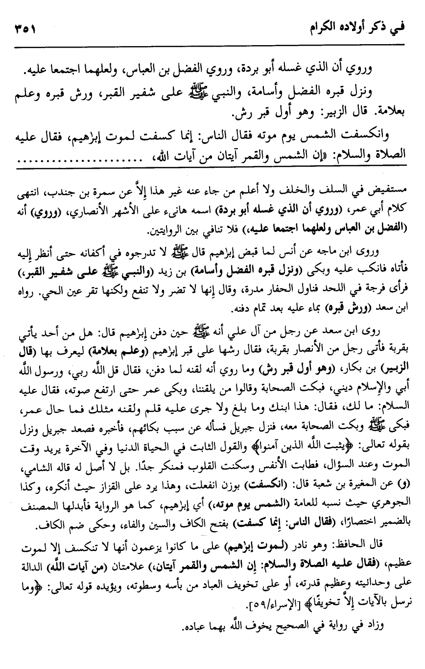 روى ابن سعد عن رجل من آل علي أنه صلى الله عليه وسلم حين دفن إبراهيم قال: "هل من أحد يأتي بقربة" فأتى رجل من الأنصار بقربة فقال: "رشها على قبر إبراهيم" "وعلم بعلاة" ليعرف بها "قال الزبير" بن بكار، "وهو أول قبر رش" وما روي أنه لقنه لما دفن فقال قل الله ربي، ورسول الله أبي والإسلام ديني، فبكت الصحابة وقالوا من يلقننا وبكي عمر حتى ارتفع صوته، فقال عليه السلام: ما لك، فقال: هذا ابنك وما بلغ ولا جرى عليه قلم ولقنه مثلك فما حال عمر، فبكى صلى الله عليه وسلم وبكت الصحابة معه، فنزل جبريل فسأله عن سبب بكائهم فأخبره فصعد جبريل ونزل بقوله تعالى: {يُثَبِّتُ اللَّهُ الَّذِينَ آمَنُوا} والقول الثابت في الحياة الدنيا وفي الآخرة يريد وقت الموت وعند السؤال فطابت الأنفس وسكنت القلوب فمنكر جدا. بل لا أصل له قاله الشامي، "و" عن المغيرة بن شعبة قال: "انكسفت" بوزن انفعلت، وهذا يرد على القزاز حيث أنكره، وكذا الجوهري حيث نسبه للعامة "الشمس يوم موته" أي إبراهيم كما هو الرواية فأبدلها المصنف بالضمير اختصارا "فقال الناس: إنما كسفت" بفتح الكاف والسين والفاء وحكى ضم الكاف.