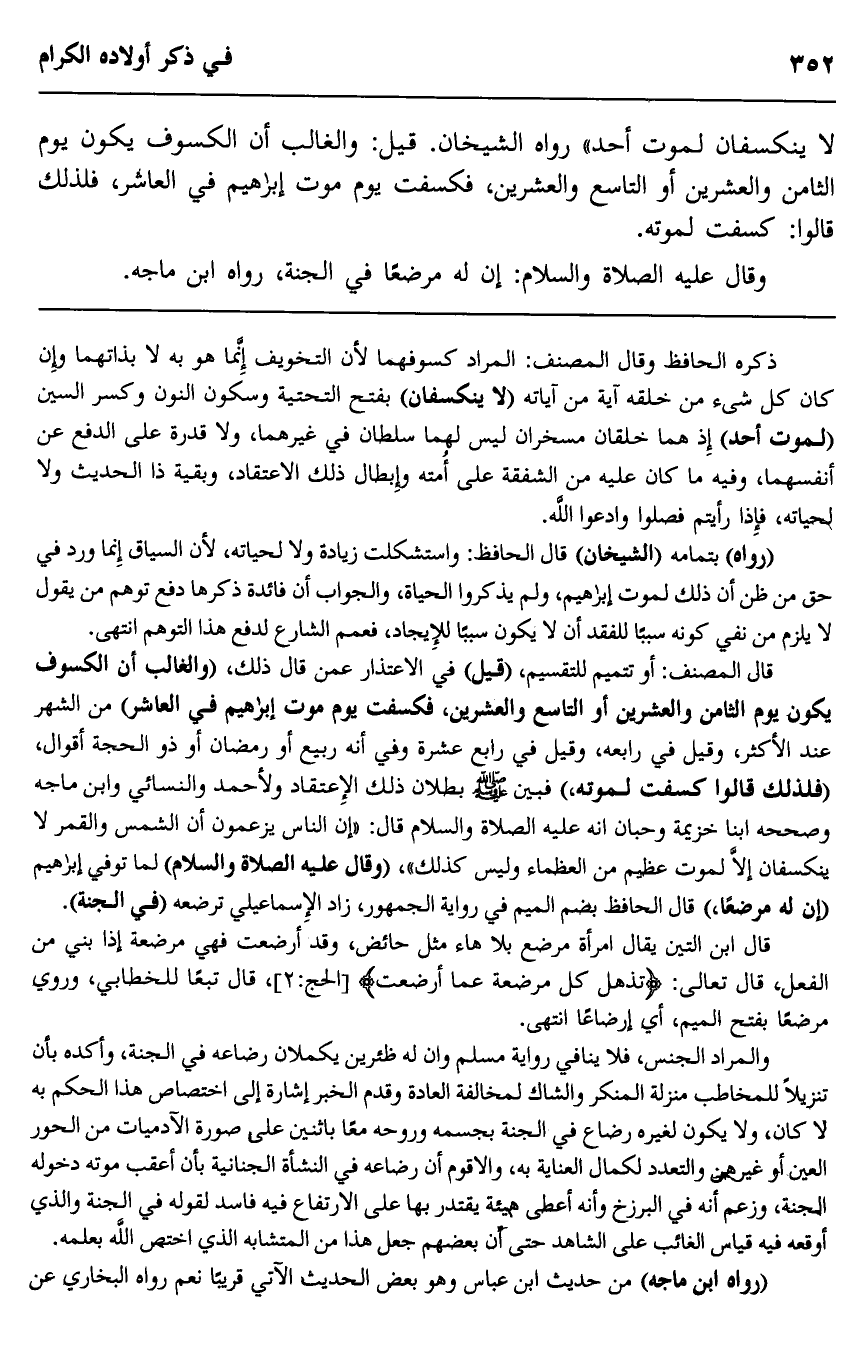 لا ينكسفان لموت أحد" رواه الشيخان. قيل: والغالب أن الكسوف يكون يوم الثامن والعشرين أو التاسع والعشرين، فكسفت يوم موت إبراهيم في العاشر، فلذلك قالوا: كسفت لموته.