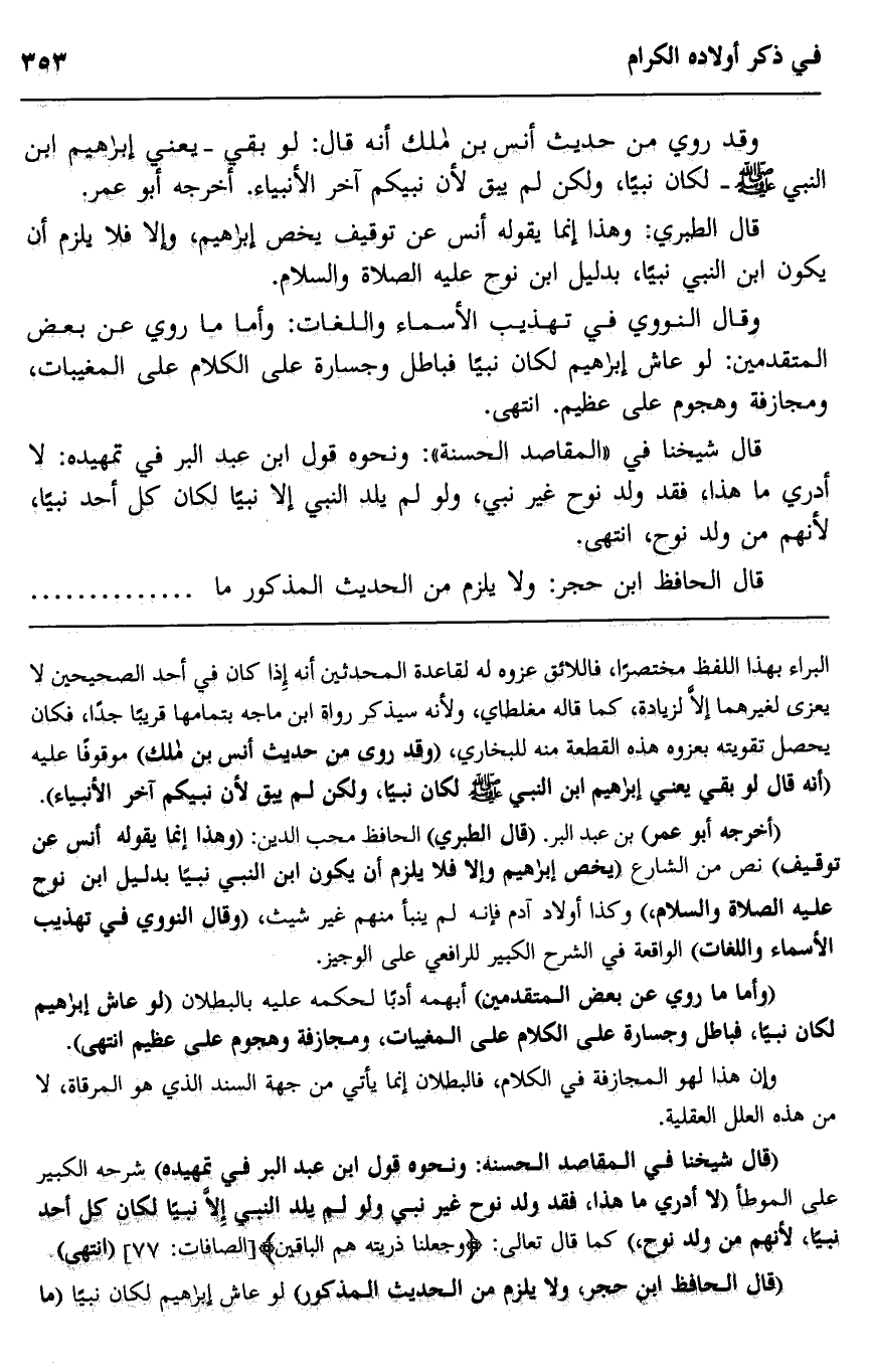 "قال الحافظ ابن حجر، ولا يلزم من الحديث المذكور" لو عاش إبراهيم لكان نبيا "ما