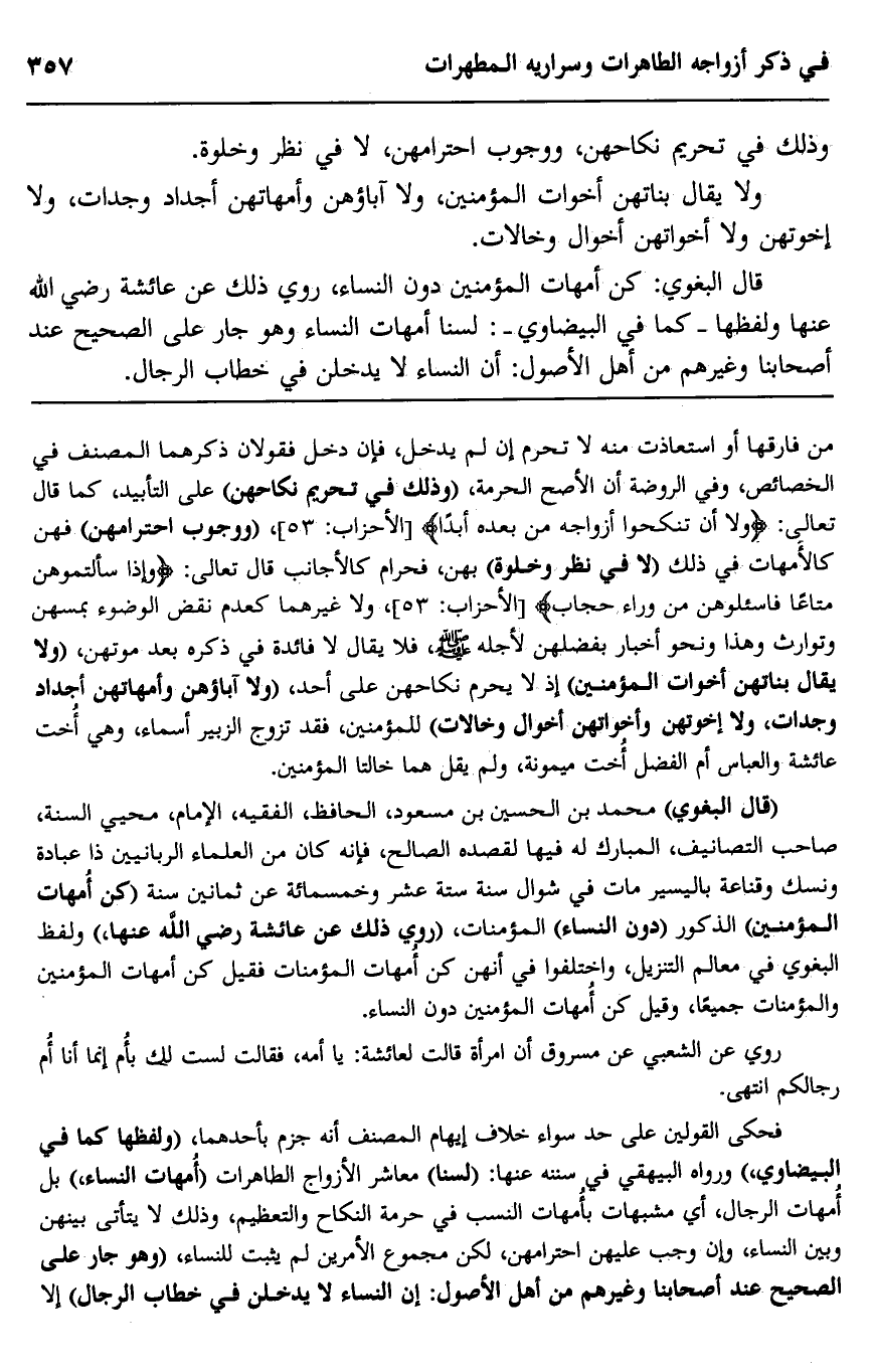 "قال البغوي" محمد بن الحسين بن مسعود، الحافظ، الفقيه، الإمام محيي السنة، صاحب التصانيف، المبارك له فيها لقصده الصالح، فإنه كان من العلماء الربانيين ذا عبادة ونسك وقناعة باليسير مات في شوال سنة ستة عشر وخمسمائة عن ثمانين سنة "كن أمهات المؤمنين" الذكور "دون النساء" الممنات. "روي ذلك عن عائشة رضي الله عنها" ولفظ البغوي في معالم التنزيل، واختلفوا في أنهن كن أمهات المؤمنين فقيل كن أمهات المؤمنين والمؤمنات جميعا، وقيل كن أمهات المؤمنين دون النساء.