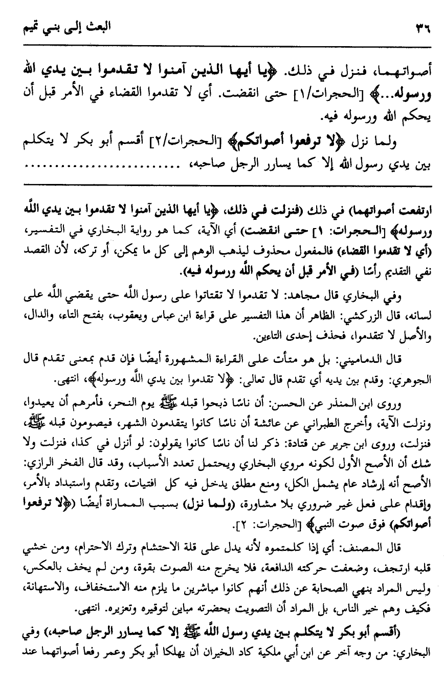 أصواتهما، فنزل في ذلك: {يَا أَيُّهَا الَّذِينَ آمَنُوا لَا تُقَدِّمُوا بَيْنَ يَدَيِ اللَّهِ وَرَسُولِهِ} [الحجرات: 1] حتى انقضت، أي لا تقدموا القضاء في الأمر قبل أن يحكم الله ورسوله فيه.