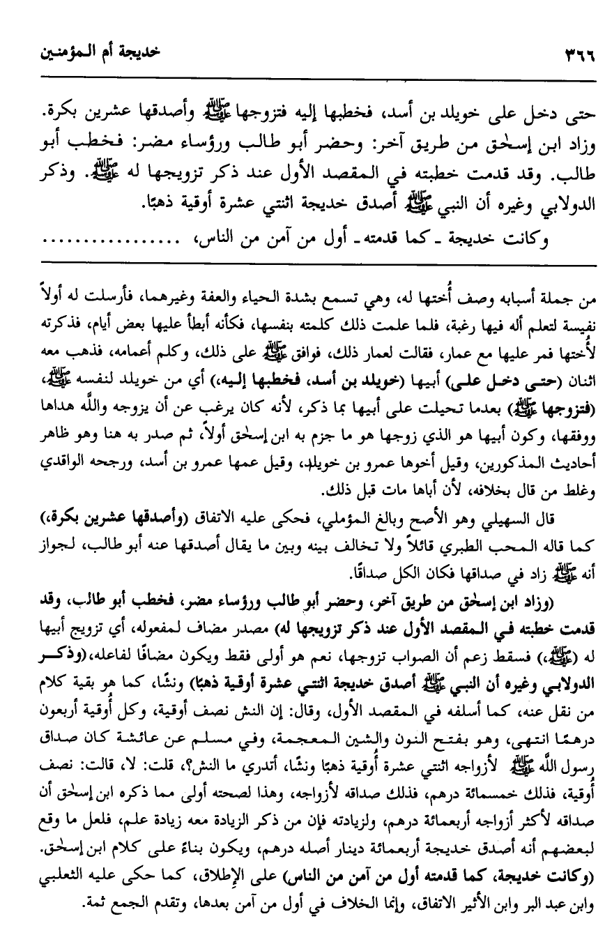 حتى دخل على خويلد بن أسد فخطبها إليه فتزوجها صلى الله عليه وسلم وأصدقها عشرين بكرة. وزاد ابن إسحاق من طريق آخر: وحضر أبو طالب ورؤساء مضر: فخطب أبو طالب وقد قدمت خطبته في المقصد الأول عند ذكر تزويجها له صلى الله عليه وسلم. وذكر الدولابي وغيره أن النبي صلى الله عليه وسلم أصدق خديجة اثنتي عشرة أوقية ذهبا.