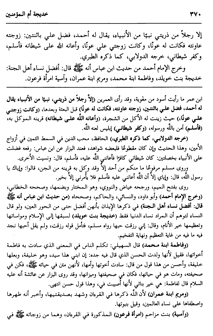 إلا رجلا من ذريتي نبيا من الأنبياء، يقال له أحمد، فضل على باثنتين، زوجته عاونته فكانت له عونا، وكانت زوجتي على عونا، وأعانه الله على شيطانه فأسلم، وكفر شيطاني، خرجه الدولابي، كما ذكره الطبري.