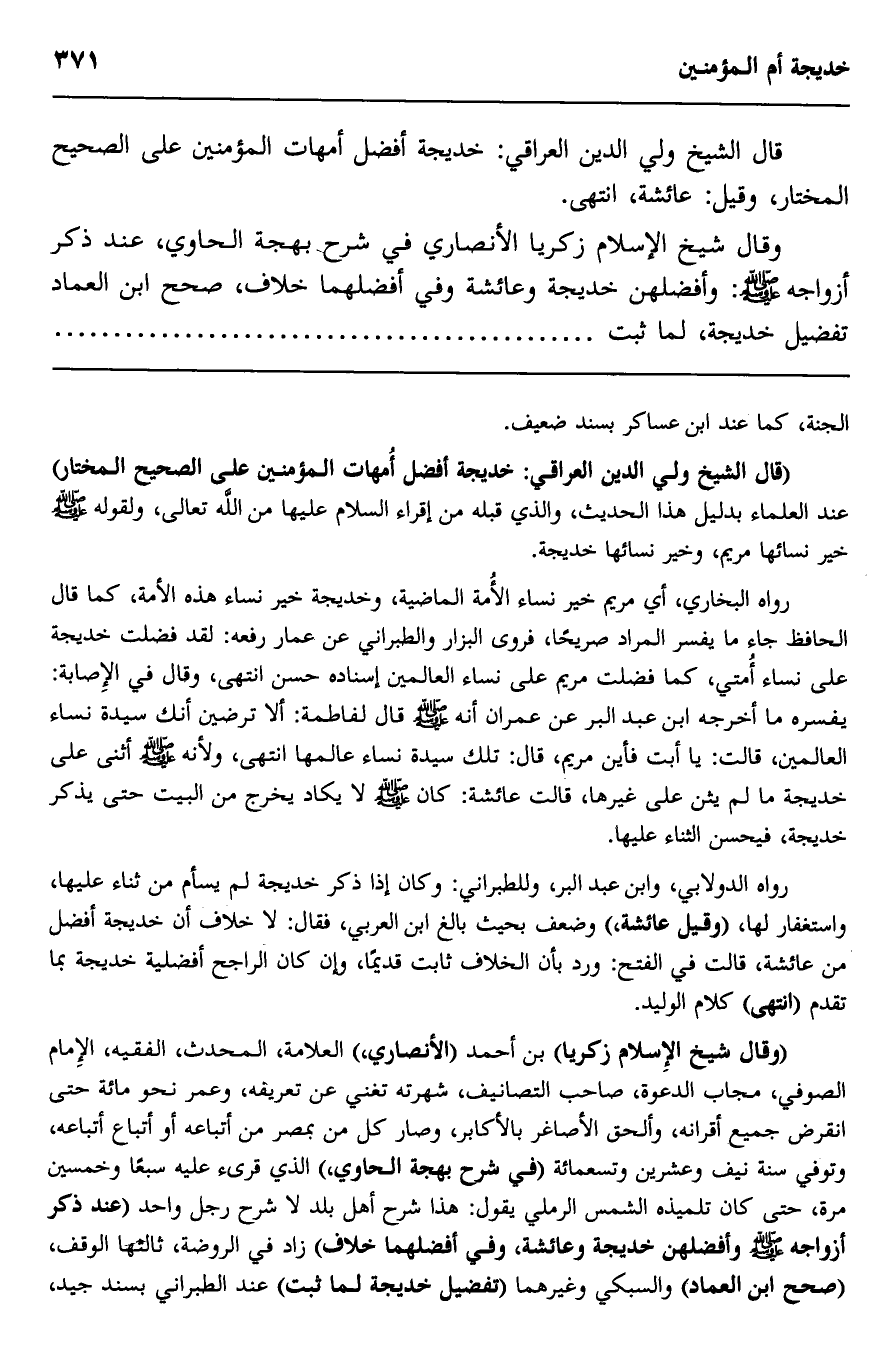 وقال شيخ الإسلام، زكريا الأنصاري في شرح بهجة الحاوي، عند ذكر أزواجه صلى الله عليه وسلم: وأفضلهن خديجة وعائشة وفي أفضلهما خلاف، صحح ابن العماد تفضيل خديجة لما ثبت.
