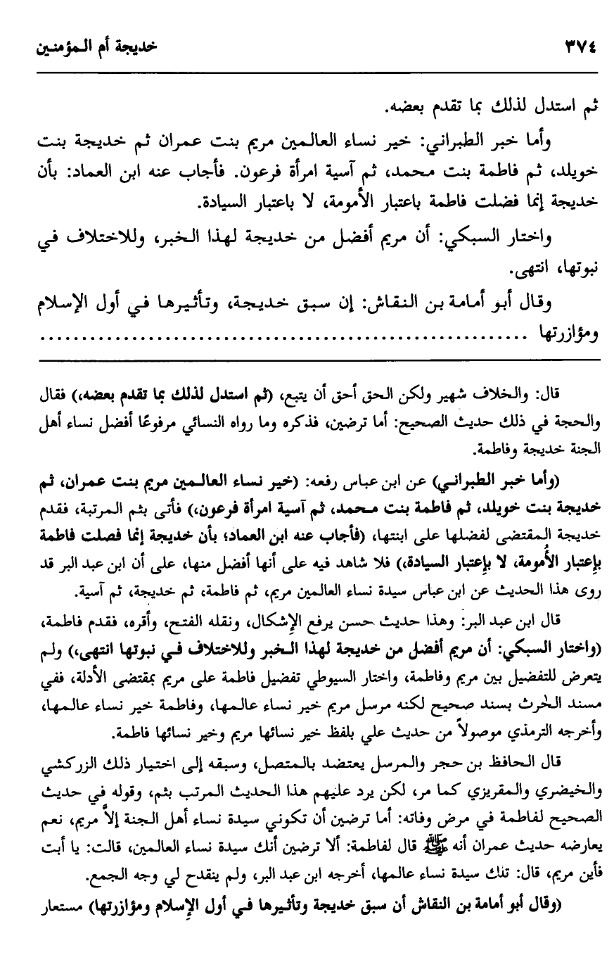 "وقاله أبو أمامة بن النقاش أن سبق خديجة وتأثيرها في أول الإسلام وموازرتها" مستعار