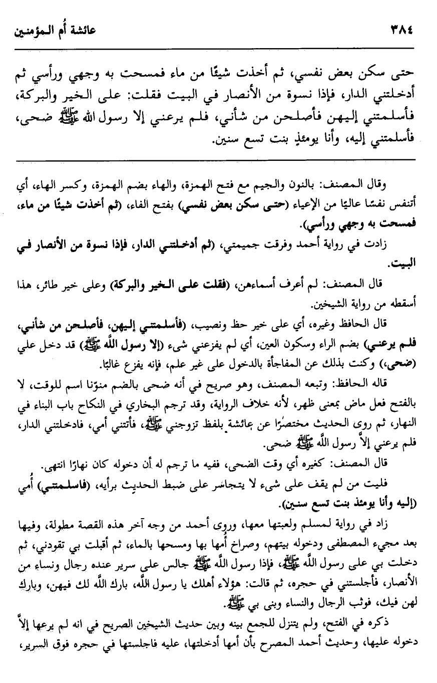 حتى سكن بعض نفسي ثم أخذت شيئا من ماء فمسحت به وجهي ورأسي ثم أدخلتني الدار فإذا نسوة من الأنصار في البيت فقلت على الخير والبركة، فأسلمتني إليها فأصلحن من شأني فلم يرعني إلا رسول الله صلى الله عليه وسلم ضحى، فأسلمتني إليه، وأنا يومئذ بنت تسع سنين.