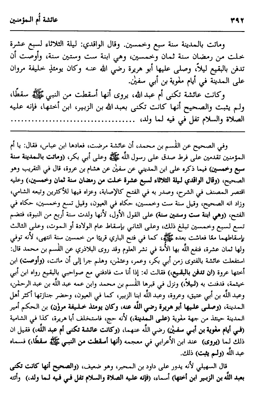 وفي الصحيح عن القاسم بن محمد، أن عائشة مرضت، فعادها ابن عباس، فقال: يا أم المؤمنين تقدمين على فرط صدق على رسول الله صلى الله عليه وسلم وعلى أبي بكر، "وماتت بالمدينة سنة سبع وخمسين" فيما ذكره علي بن المديني عن سفيان عن هشام بن عروة، قال في التقريب وهو الصحيح، "وقال الواقدي ليلة الثلاثاء لسبع عشرة خلت من رمضان سنة ثمان وخمسين، وعليه اقتصر المصنف في الشرح، وصدر به في الفتح كالإصابة وعزاه فيها للأكثرين وتبعه الشامي، وزاد أنه الصحيح، وقيل سنة ست وخمسين، حكاه في العيون، وقيل تسع وخمسين، حكاه في الفتح "وهي ابنة ست وستين سنة" على القول الأول؛ لأنها ولدت سنة أربع من النبوة، فتضم تسع لسبع وخمسين تبلغ ذلك، وعلى الثاني بإسقاط عام الولادة أو الموت، وعلى الثالث بإسقاطهما معا فعاشت بعده صلى الله عليه وسلم، كما في فتح الباري قريبا من خمسين سنة انتهى؛ لأنه توفي ولها ثمان عشرة، فنفع الله بها الأمة في نشر العلوم وقد روى البلاذري عن القاسم بن محمد قال: استفعلت عائشة بالفتوى زمن أبي بكر، وعمر، وعثمان، وهلم جرا إلى أن ماتت, "وأوصت" ابن أختها عروة "أن تدفن بالبقيع"، فقال له: إذا أنا مت فادفني مع صواحبي بالبقيع رواه ابن أبي خيثمة، فدفنت به "ليلا" ونزل في قبرها القاسم بن محمد وابن عمه عبد الله بن عبد الرحمن، وعبد الله بن أبي عتيق، وعروة، وعبد الله بن الزبير، كما في العيون، وحضر جنازتها أكثر أهل المدنية، "وصلى عليها أبو هريرة رضي الله عنه، وكان يومئذ خليفة مروان" بن الحكم أمير المدينة حينئذ من جهة معاوية "على المدينة" لأنه حج، فاستخلف أبو هريرة كذا في الشامية "في أيام معاوية بن أبي سفيان" رضي الله عنهما "وكانت عائشة تكنى أم عبد الله"، فقيل إن ذلك لما يروى عند ابن الأعرابي في معجمه "أنها أسقطت من النبي صلى الله عليه وسلم سقطا فسماه عبد الله ولم يثبت ذلك.