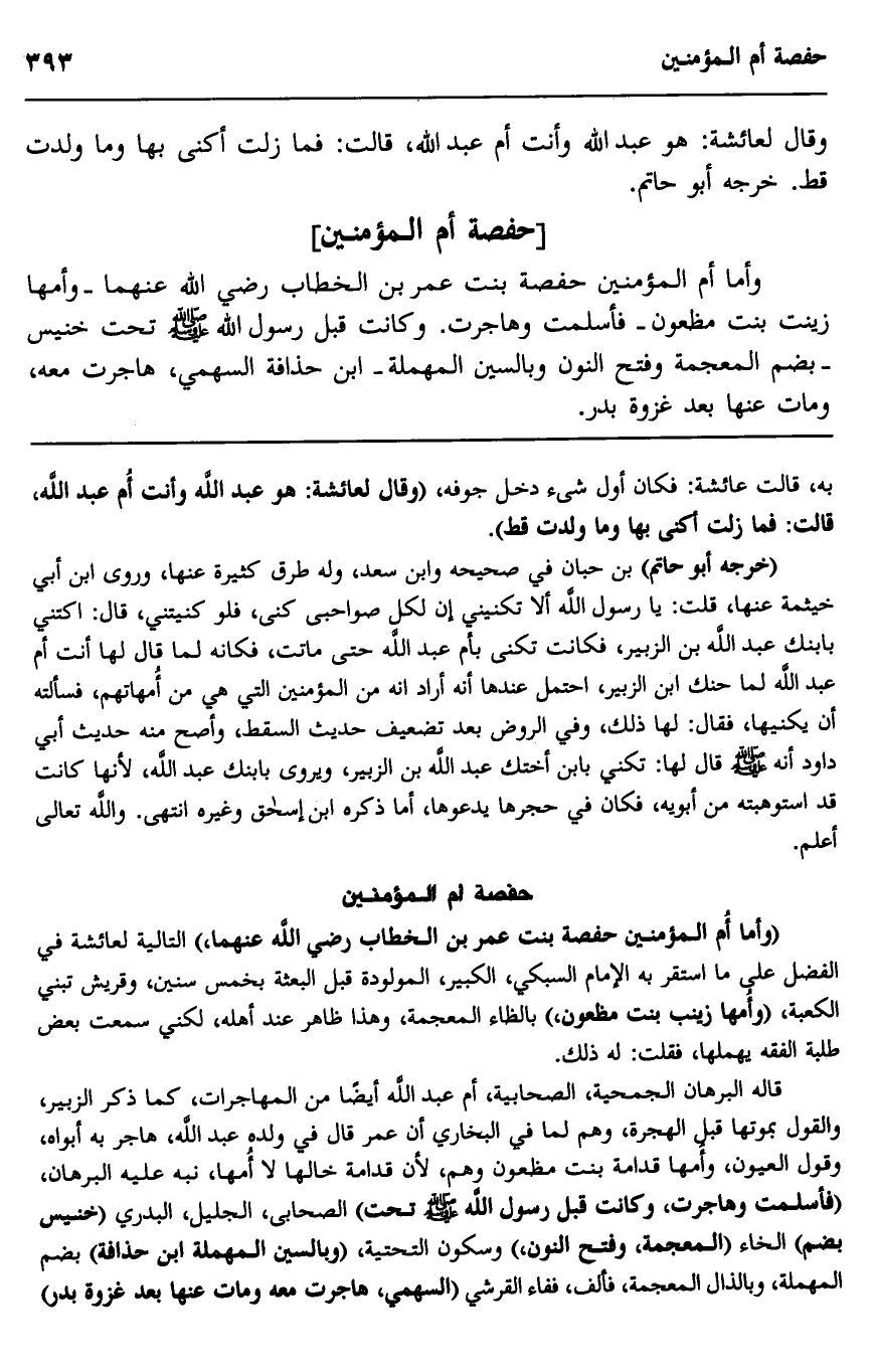 "وأما أم المؤمنين حفصة بنت عمر بن الخطاب رضي الله عنهما" التالية لعائشة في الفضل على ما استقر به الإمام السبكي، الكبير، المولودة قبل البعثة بخمس سنين، وقريش تبني الكعبة، وأمها زينب بنت مظعون، بالظاء المعجمة، وهذا ظاهر عند أهله، لكني سمعت بعض طلبة الفقه يهملها، فقلت له ذلك.