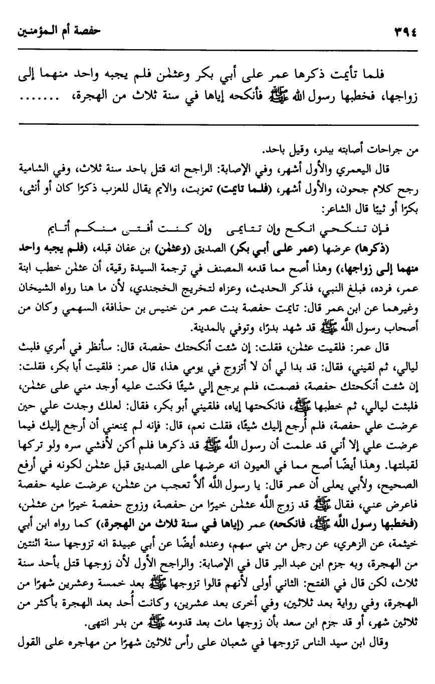 فلما تأيمت ذكرها عمر على أبي بكر وعثمان فلم يجبه واحد منهما إلى زواجها، فخطبها رسول الله صلى الله عليه وسلم فأنكحه إياها في سنة ثلاث من الهجرة،