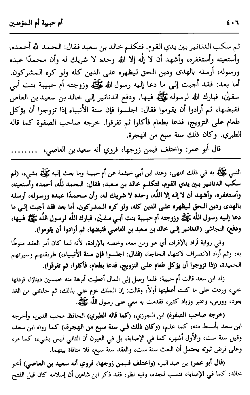 النبي صلى الله عليه وسلم به في ذلك انتهى، وعند ابن أبي خيثمة عن أم حبيبة وما بعث إليه صلى الله عليه وسلم بشيء، "ثم سكب الدنانير بين يدي القوم، فتكلم خالد بن سعيد، فقال: الحمد لله، أحمده وأستعينه، واستغفره، وأشهد أن لا إله إلا الله، وحده لا شريك له، وأن محمدا عبده ورسوله، أرسله بالهدى ودين الحق ليظهره على الدين كله، ولو كره المشركون أما بعد فقد أجبت إلى ما دعا إليه رسول الله صلى الله عليه وسلم وزوجته أم حبيبة بنت أبي سفيان فبارك الله لرسول الله صل الله عليه وسلم فيها، ودفع" النجاشي "الدنانير إلى خالد بن سعيد بن العاصي فقبضها ثم أرادوا أن يقوموا".