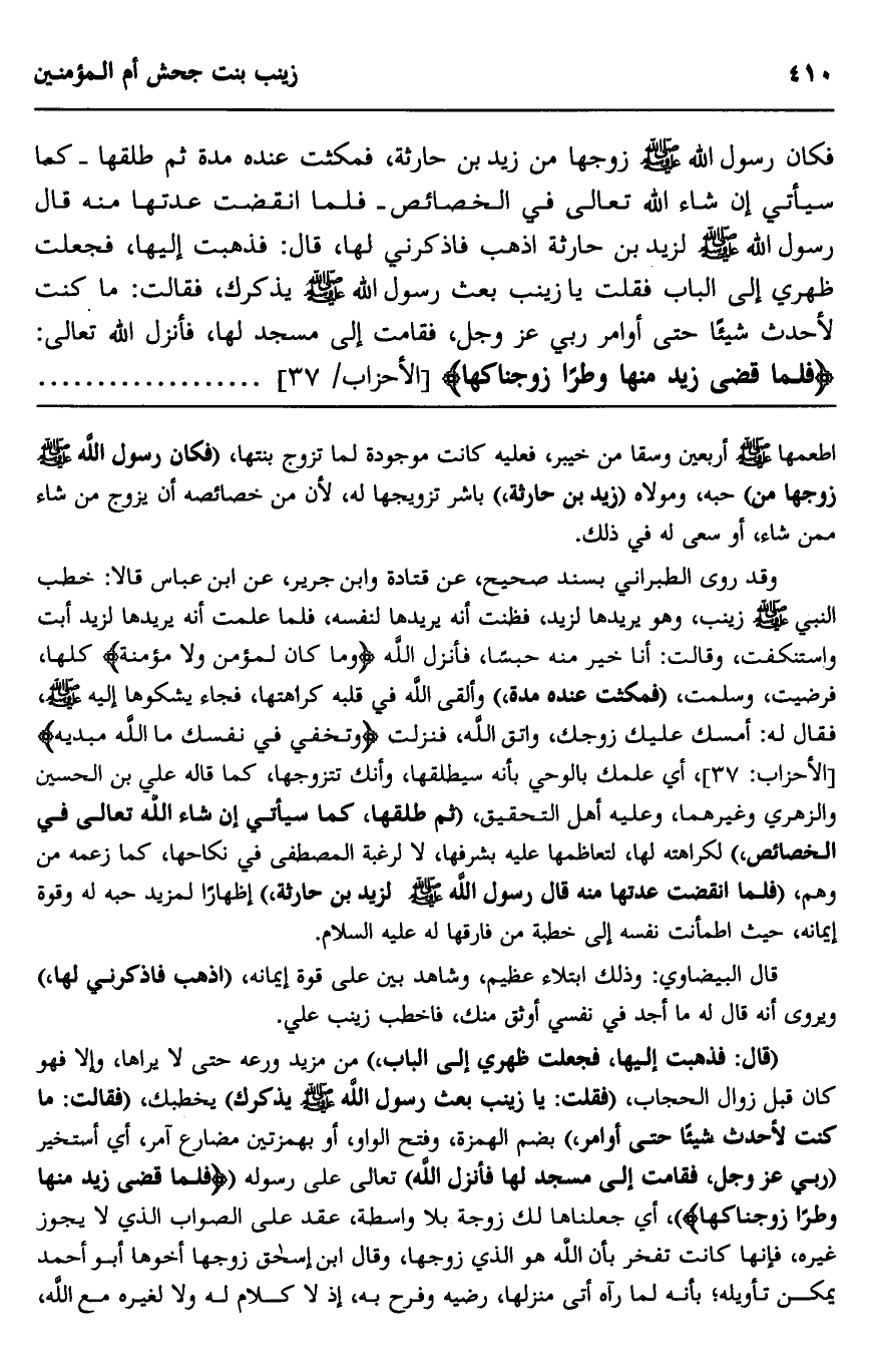 وقد روى الطبراني بسند صحيح، عن قتادة وابن جرير، عن ابن عباس، قالا: خطب النبي صلى الله عليه وسلم زينب، وهو يريدها لزيد، فظنت أنه يريدها لنفسه، فلما علمت أنه يريدها لزيد أبت واستنكفت، وقالت: أنا خير منه حسبا، فأنزل الله {وَمَا كَانَ لِمُؤْمِنٍ وَلا مُؤْمِنَةٍ} كلها، فرضيت، وسلمت "فمكثت عنده مدة" ألقى الله في قلبه كراهتها، فجاء يشكوها إليه صلى الله عليه وسلم، فقال له: "أمسك عليك زوجك، واتق الله"، فنزلت {وَتُخْفِي فِي نَفْسِكَ مَا اللَّهُ مُبْدِيهِ} [الأحزاب: 37] ، أي علمك بالوحي بأنه سيطلقها وأنك تتزوجها، كما قاله علي بن الحسين والزهري وغيرهما، وعليه أهل التحقيق، "ثم طلقها، كما سيأتي إن شاء الله تعالى في الخصائص" لكراهته لها، لتعاظمها عليه بشرفها، لا لرغبة المصطفى في نكاحها، كما زعمه من وهم، "فلما انقضت عدتها منه قال رسول الله صلى الله عليه وسلم لزيد بن حارثة" إظهارا لمزيد حبه له وقوة إيمانه، حيث اطمأنت نفسه إلى خطبة من فارقها عليه السلام.