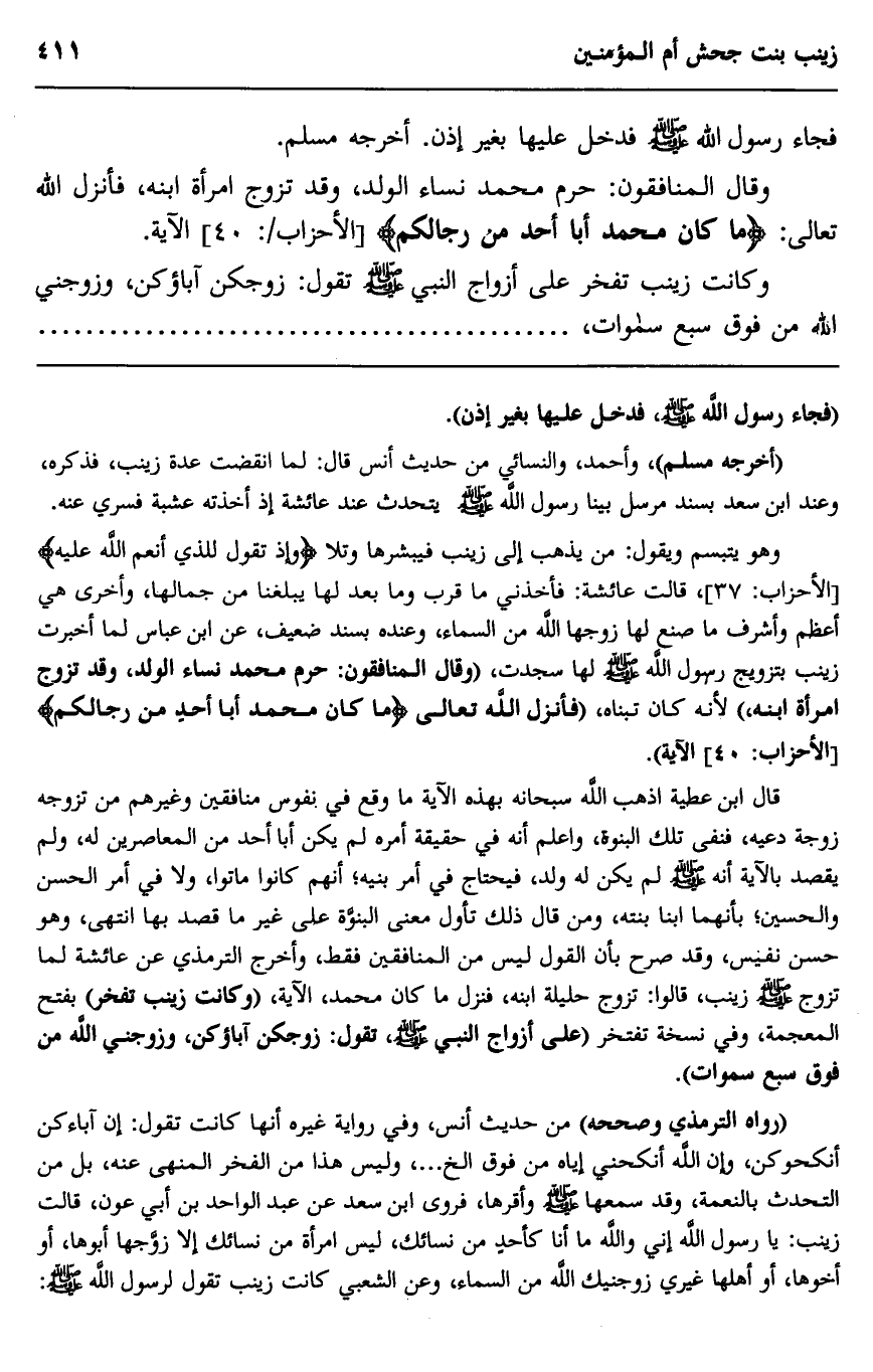 وقال المنافقون: حرم محمد نساء الولد، وقد تزوج امرأة ابنه، فأنزل الله تعالى: {مَا كَانَ مُحَمَّدٌ أَبَا أَحَدٍ مِنْ رِجَالِكُمْ} [الأحزاب: 40] الآية.