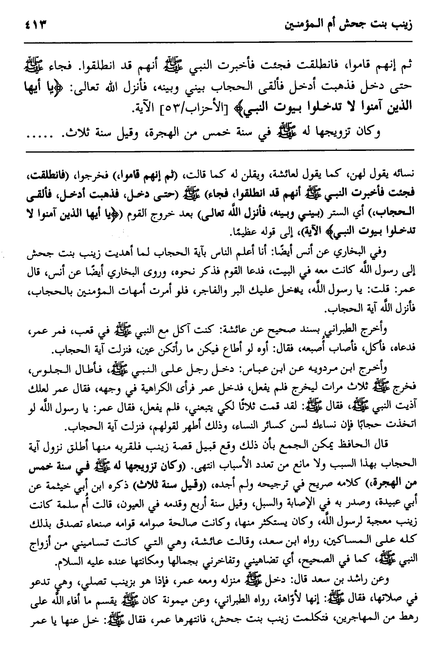 وفي البخاري عن أنس أيضا، أنا أعلم الناس بآية الحجاب لما أهديت زينب بنت جحش إلى رسول الله كانت معه في البيت فدعا القوم فذكر نحوه، وروى البخاري أيضا عن أنس قال عمر: قلت: يا رسول الله يدخل عليك البر والفاجر، فلو أمرت أمهات المؤمنين بالحجاب، فأنزل الله آية الحجاب.