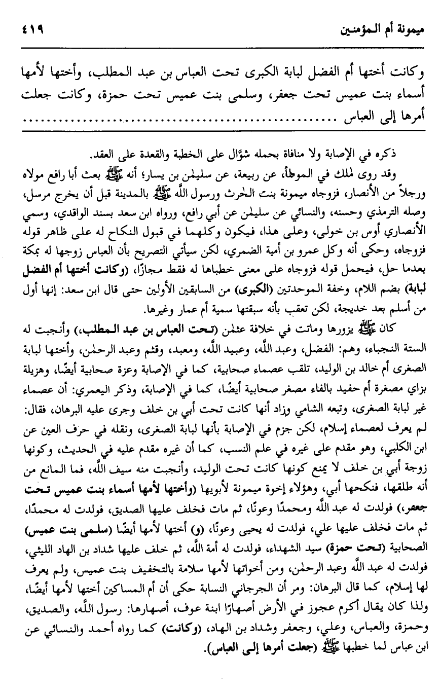 كان صلى الله عليه وسلم يزورها وماتت في خلافة عثمان "تحت العباس بن عبد المطلب" وأنجبت له الستة النجباء، وهم: الفضل، وعبد الله، وعبيد الله، ومعبد، وقثم وعبد الرحمن، وأختها لبابة الصغرى أم خالد بن الوليد، تلقب عصماء صحابية، كما في الإصابة وعزة صحابية أيضا، وهزيلة بزاي مصغرة أم حفيد بالفاء مصغر صحابية أيضا، كا في الإصابة، وذكر اليعمري: أن عصماء غير لبابة الصغرى، وتبعه الشامي وزاد أنها كانت تحت أبي بن خلف وجرى عليه البرهان، فقال: لم يعرف لعصماء إسلام، لكن جزم في الإصابة بأنها لبابة الصغرى، ونقله في حرف العين عن ابن الكلبي، وهو مقدم على غيره في علم النسب، كما أن غيره مقدم عليه في الحديث، وكونها زوجة أبي بن خلف لا يمنع كونها كانت تحت الوليد، وأنجبت منه سيف الله، فما المانع من أنه طلقها، فنكحها أبي، وهؤلاء إخوة ميمونة لأبويها "وأختها لأمها أسماء بنت عميس تحت جعفر" فولدت له عبد الله ومحمدا وعونا، ثم مات فخلف عليها الصديق، فولدت له محمدا، ثم مات فخلف عليها علي، فولدت له يحيى وعونا، "و" أختها لأمها أيضا "سلمى بنت عميس" الصحابية "تحت حمزة" سيد الشهداء، فولدت له أمة الله، ثم خلف عليها شداد بن الهاد الليثي، فولدت له عبد الله وعبد الرحمن، ومن أخواتها لأمها سلامة بالتخفيف بنت عميس، ولم يعرف لها إسلام كما قال البرهان: ومر أن الجرجاني النسابة حكى أن أم المساكين أختها لأمها أيضا، ولذا كان يقال أكرم عجوز في الأرض أصهارا ابنة عوف، أصهارها: رسول الله، والصديق، وحمزة، والعباس، وعلي، وجعفر وشداد بن الهاد، "وكانت" كما رواه أحمد والنسائي عن ابن عباس لما خطبها صلى الله عليه وسلم "جعلت أمرها إلى العباس".