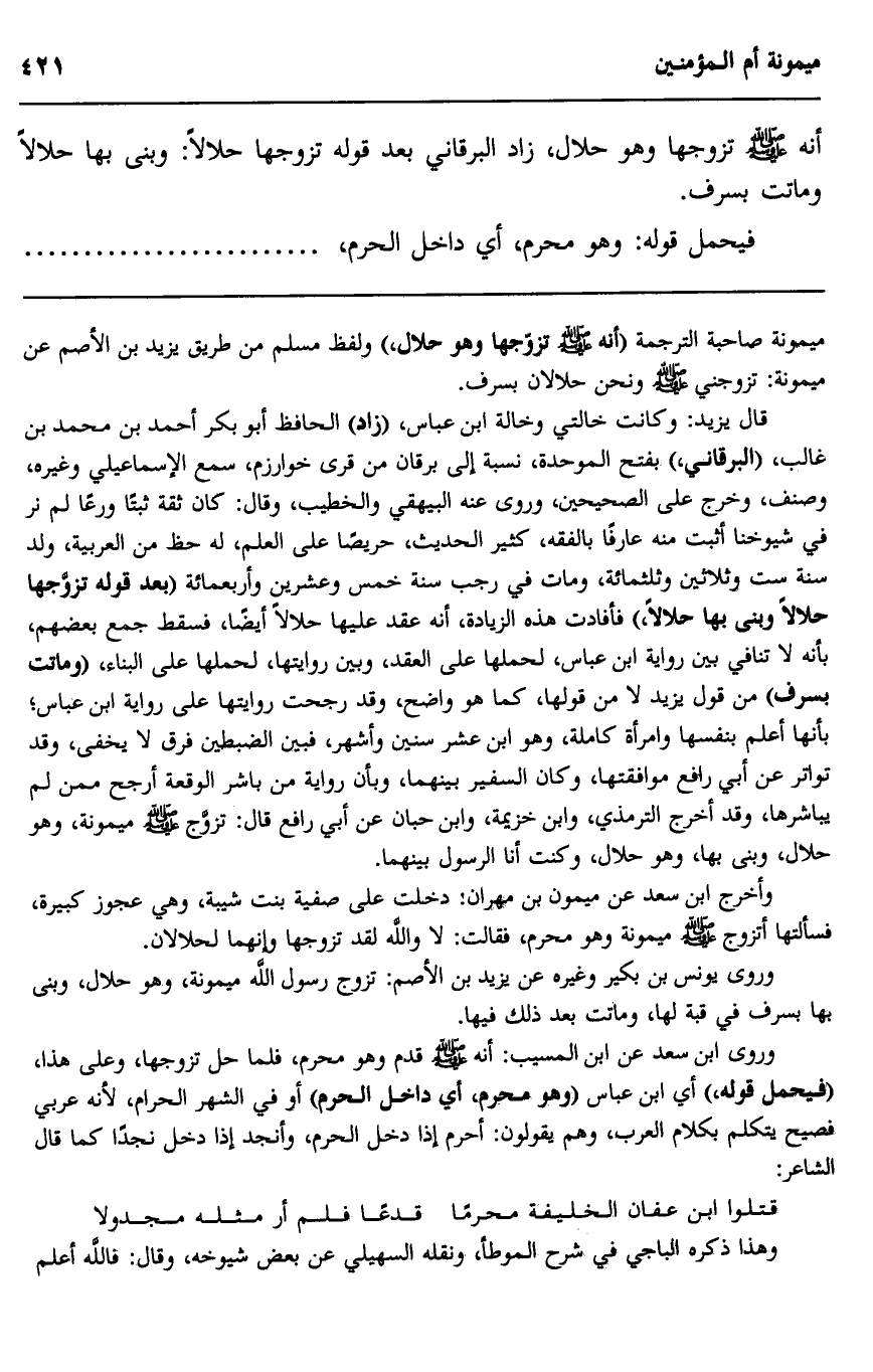 ميمونة صاحبة الترجمة "أنه صلى الله عليه وسلم تزوجها وهو حلال" ولفظ مسلم من طريق يزيد بن الأصم عن ميمونة: تزوجني صلى الله عليه وسلم ونحن حلالان بسرف.