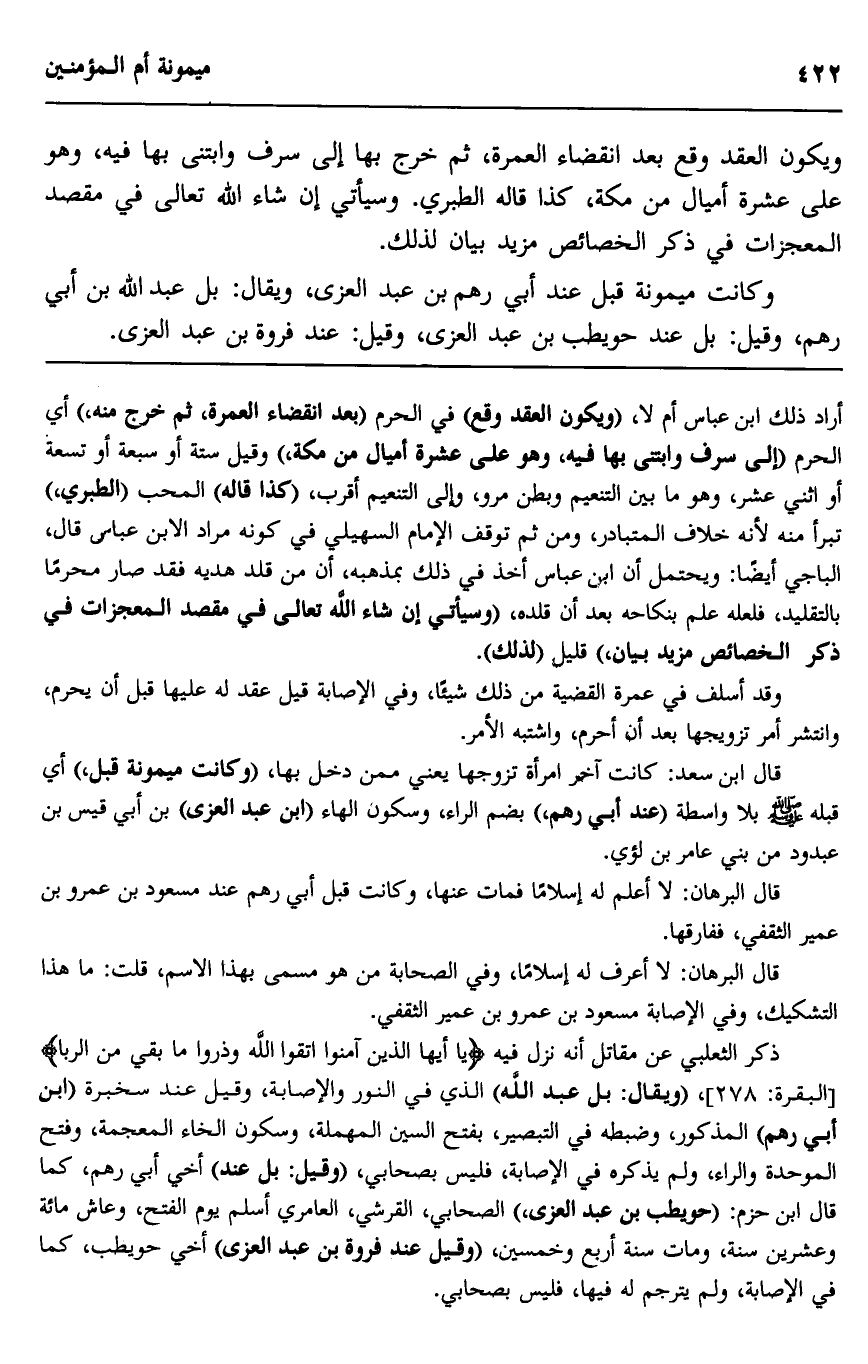 ويكون العقد وقع بعد انقضاء العمرة، ثم خرج بها إلى سرف وابتنى بها فيه، وهو على عشرة أميال من مكة، كذا قاله الطبري. وسيأتي إن شاء الله تعالى، في مقصد المعجزات في ذكر الخصائص مزيد بيان لذلك.