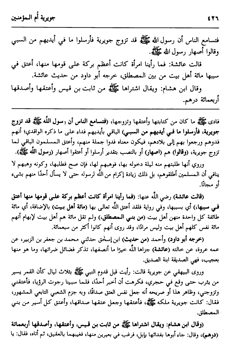 "وقال ابن هشام: ويقال اشتراها صلى الله عليه وسلم من ثابت بن قيس، وأعتقها، وأصدقها أربعمائة "درهم"، وقال: جاء أبوها بفدائها بإبل، فرغب في بعيرين منها، فغيبهما بالعقيق، ثم أتاه، فقال: يا
