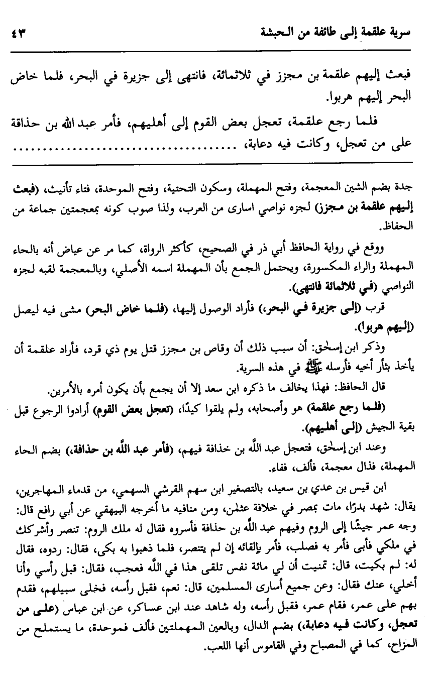 وعند ابن إسحاق، فتعجل عبد الله بن خذافة، فيهم، "فأمر عبد الله بن حذافة،" بضم الحاء المهملة، فذال معجمة، فألف، ففاء.