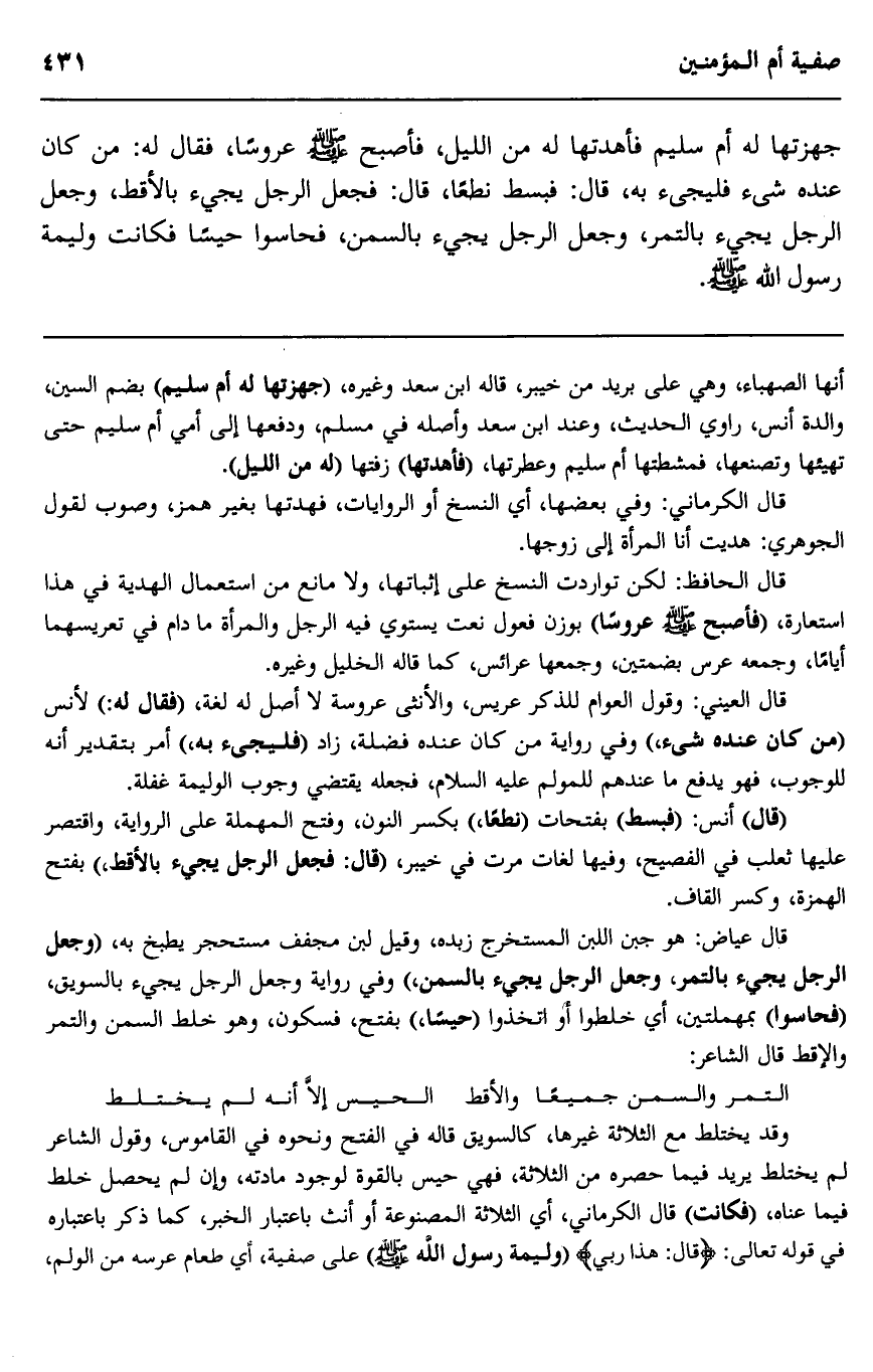 وقد يختلط مع الثلاثة غيرها، كالسويق قاله في الفتح ونحوه في القاموس وقول الشاعر لم يختلط يريد فيما حصره من الثلاثة فهي حيس بالقوة لوجود مادته، وإن لم يحصل خلط فيما عناه، "فكانت" قال الكرماني، أي الصلاة المصنوعة أو أنث باعتبار الخبر كما ذكر باعتباره في قوله تعالى: {قَالَ هَذَا رَبِّي} "وليمة رسول الله صلى الله عليه وسلم" على صفية أي طعام عرسه من الولم،