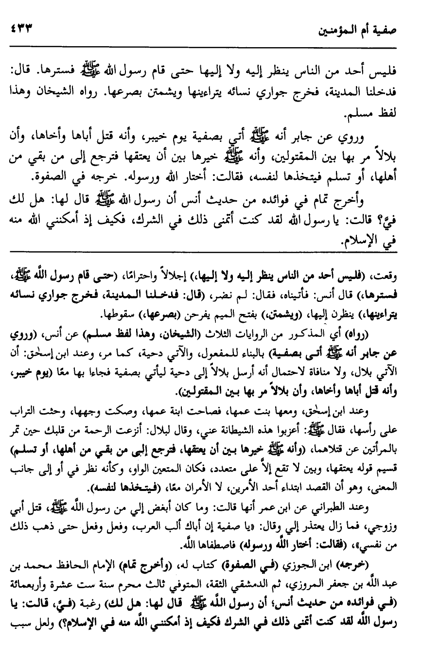 وروي عن جابر أنه صلى الله عليه وسلم أتي بصفية يوم خيبر، وأنه قتل أباها وأخاها، وأن بلالا مر بها بين المقتولين، وأنه صلى الله عليه وسلم خيرها بين أن يعتقها فترجع إلى من بقي من أهلها، أو تسلم فيتخذها لنفسه، فقالت: أختار الله ورسوله، خرجه في الصفوة.