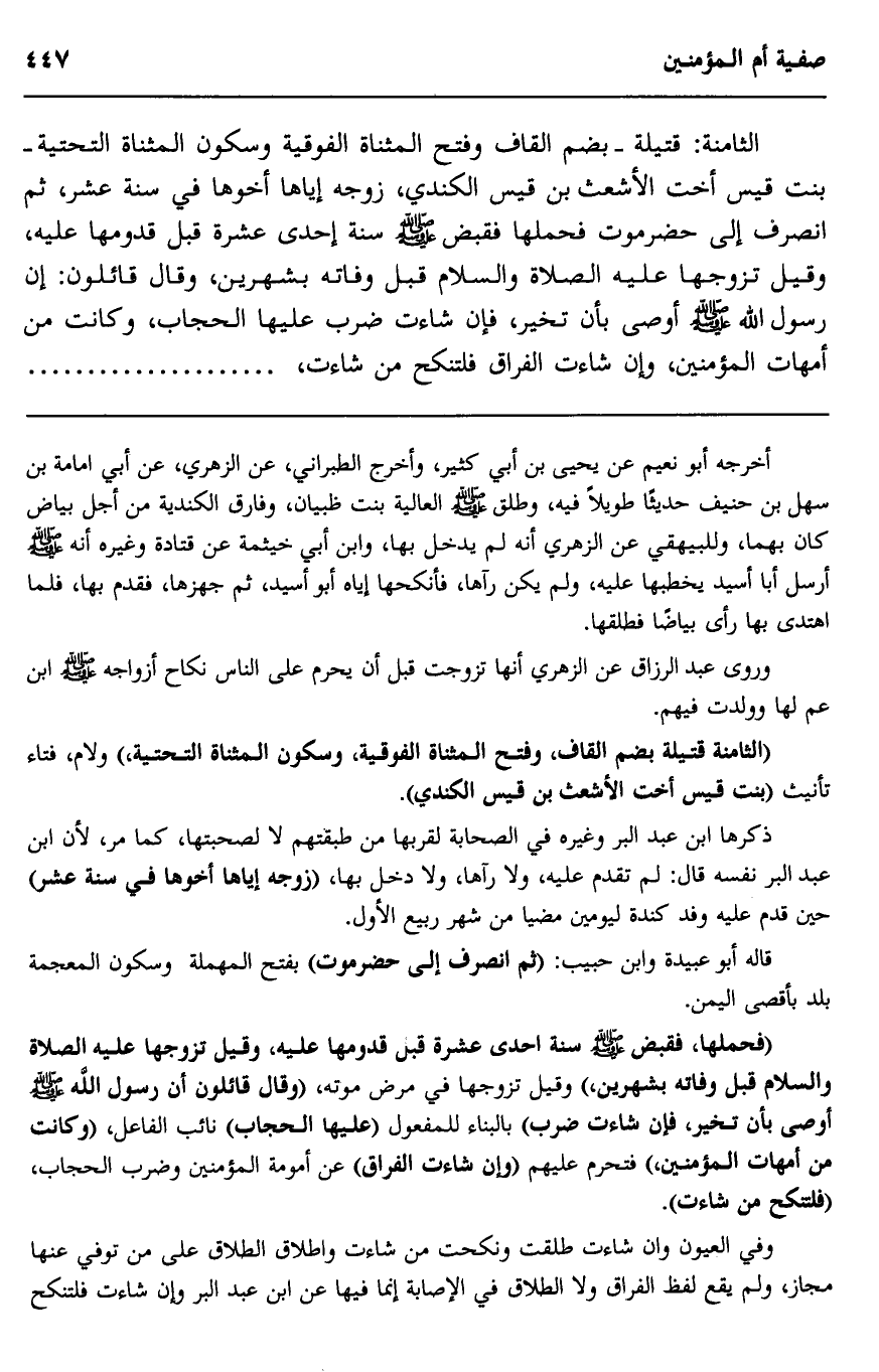 الثامنة: قتيلة بضم القاف وفتح المثناة الفوقية وسكون المثناة التحتية بنت قيس أخت الأشعث بن قيس الكندي، زوجه إياها أخوها في سنة عشر، ثم انصرف إلى حضرموت فحملها فقبض صلى الله عليه وسلم سنة إحدى عشرة قبل قدومها عليه، وقيل تزوجها عليه الصلاة والسلام قبل وفاته بشهرين، وقال قائلون: إن رسول الله صلى الله عليه وسلم أوصى بأن تخير، فإن شاءت ضرب عليها الحجاب، وكانت من أمهات المؤمنين، وإن شاءت الفراق فلتنكح من شاءت.
