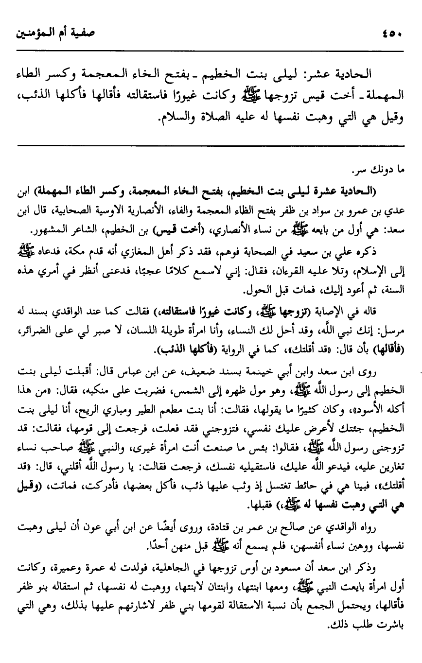 الحادية عشر: ليلى بنت الخطيم -بفتح الخاء المعجمة وكسر الطاء المهملة- أخت قيس تزوجها صلى الله عليه وسلم وكانت غيورا فاستقالته فأقالها فأكلها الذئب، وقيل هي التي وهبت نفسها له عليه الصلاة والسلام.