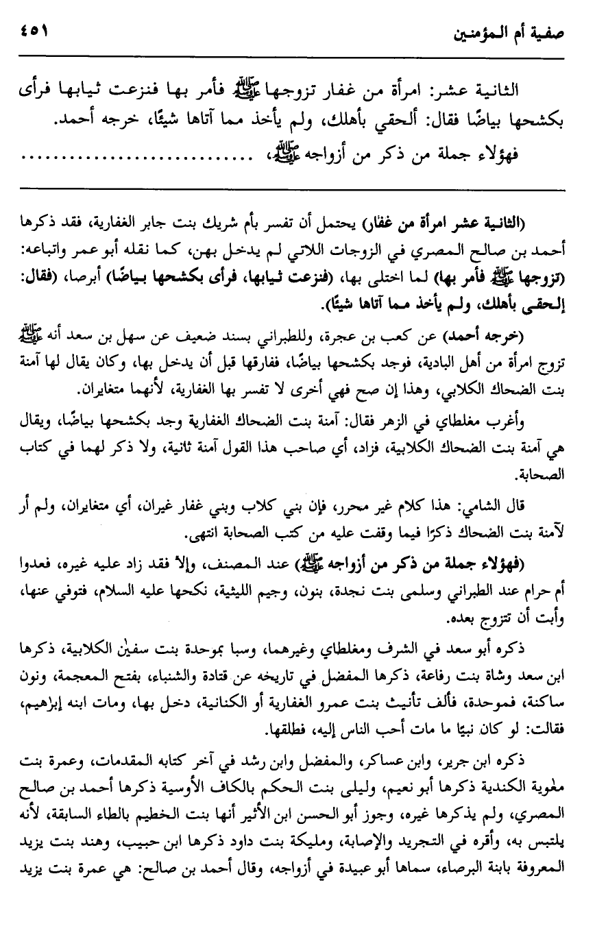 ذكره ابن جرير، وابن عساكر، والمفضل وابن رشد في آخر كتابه المقدمات، وعمرة بنت معاوية الكندية ذكرها أبو نعيم، وليلى بنت الحكم بالكاف الأوسية ذكرها أحمد بن صالح المصري، ولم يذكرها غيره، وجوز أبو الحسن بن الأثير أنها بنت الخطيم بالطاء السابقة؛ لأنه يلتبس به، وأقره في التجريد والإصابة، ومليكة بنت داود ذكرها ابن حبيب، وهند بنت يزيد المعروفة بابنة البرصاء، سماها أبو عبيدة في أزواجه، وقال أحمد بن صالح: هي عمرة بنت يزيد