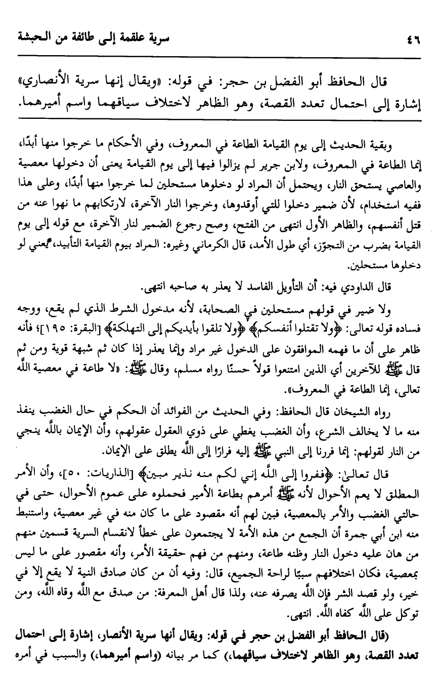 قال تعالى: {فَفِرُّوا إِلَى اللَّهِ إِنِّي لَكُمْ مِنْهُ نَذِيرٌ مُبِينٌ} [الذاريات: 50] ، وأن الأمر المطلق لا يعلم الأحوال؛ لأنه صلى الله عليه وسلم أمرهم بطاعة الأمير فحملوه على عموم الأحوال، حتى في حالتي الغضب والأمر بالمعصية، فبين لهم أنه مقصود على ما كان منه في غير معصية، واستنبط منه ابن أبي جمرة أن الجمع من هذه الأمة لا يجتمعون على خطأ لانقسام السرية قسمين منهم من هان عليه دخول النار وظنه طاعة، ومنهم من فهم حقيقة الأمر، وأنه مقصور على ما ليس بمعصية، فكان اختلافهم سببا لراحة الجميع، قال: وفيه أن من كان صادق النية لا يقع إلا في خير، ولو قصد الشر فإن الله يصرفه عنه، ولذا قال أهل المعرفة، من صدق مع الله وقاه الله، ومن توكل على الله كفاه الله. اهـ.
