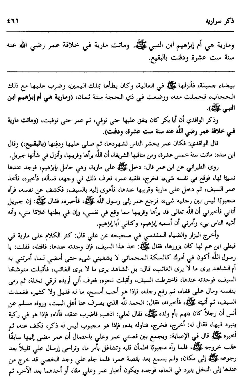 بيضاء جميلة، فأنزلها صلى الله عليه وسلم في العالية، وكان يطأها بملك اليمين، وضرب عليها مع ذلك الحجاب، فحملت منه، ووضعت في ذي الحجة سنة ثمان، "ومارية هي أم إبراهيم ابن النبي صلى الله عليه وسلم".