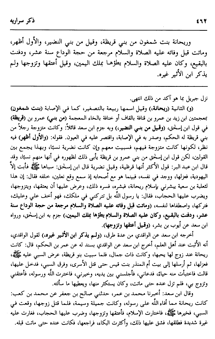 أخرجه ابن سعد عن الواقدي من عدة طرق، "ولم يذكر ابن الأثير غيره، لقول الواقدي، إنه الأثبت عند أهل العلم، أخرج ابن سعد عن الواقدي بسند له عن عمر بن الحكم، قال: كانت ريحانة عند زوج لها يحبها، وكانت ذات جمال، فلما سبيت بنو قريظة، عرض السبي عليه صلى الله عليه وسلم، فعزلها، ثم أرسلها إلى بيت أم المنذر بنت قيس حتى قتل الأسرى، وفرق السبي، فدخل عليها، قالت: فاختبأت منه حياء، فدعاني فأجلسني بين يديه، وخيرني، فاخترت الله ورسوله، فأعتقني وتزوج بي، فلم تزل عنده حتى ماتت، وكان يستكثر منها، ويعطيها ما سألته.