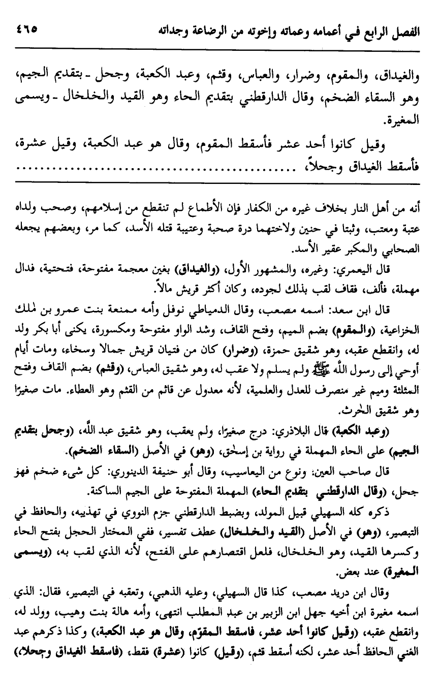 وقال ابن دريد مصعب، كذا قال السهيلي، وعليه الذهبي، وتعقبه في التبصير، فقال: الذي اسمه مغيرة ابن أخيه جهل بن الزبير بن عبد المطلب انتهى، وأمه هالة بنت وهيب وولد له، وانقطع عقبه، "وقيل كانوا أحد عشر، فاسقط المقوم، قال هو عبد الكعبة"، وكذا ذكرهم عبد الغني الحافظ أحد عشر، لكنه أسقط قثم "وقيل" كانوا "عشرة" فقط، "فاسقط الغيداق وجحلا".
