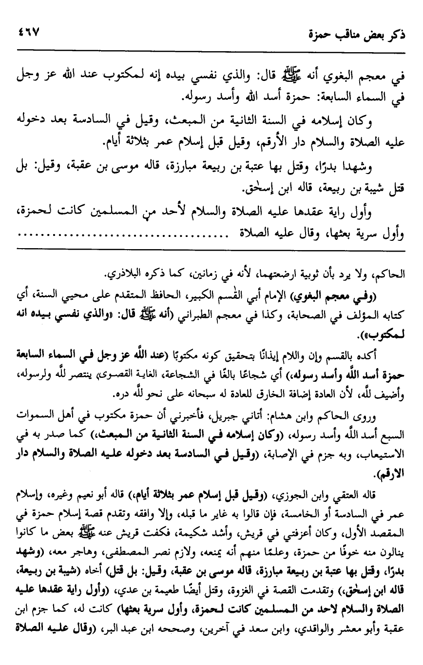 في معجم البغوي أنه صلى الله عليه وسلم قال: "والذي نفسي بيده إنه لمكتوب عند الله عز وجل في السماء السابعة، حمزة أسد الله وأسد رسوله".