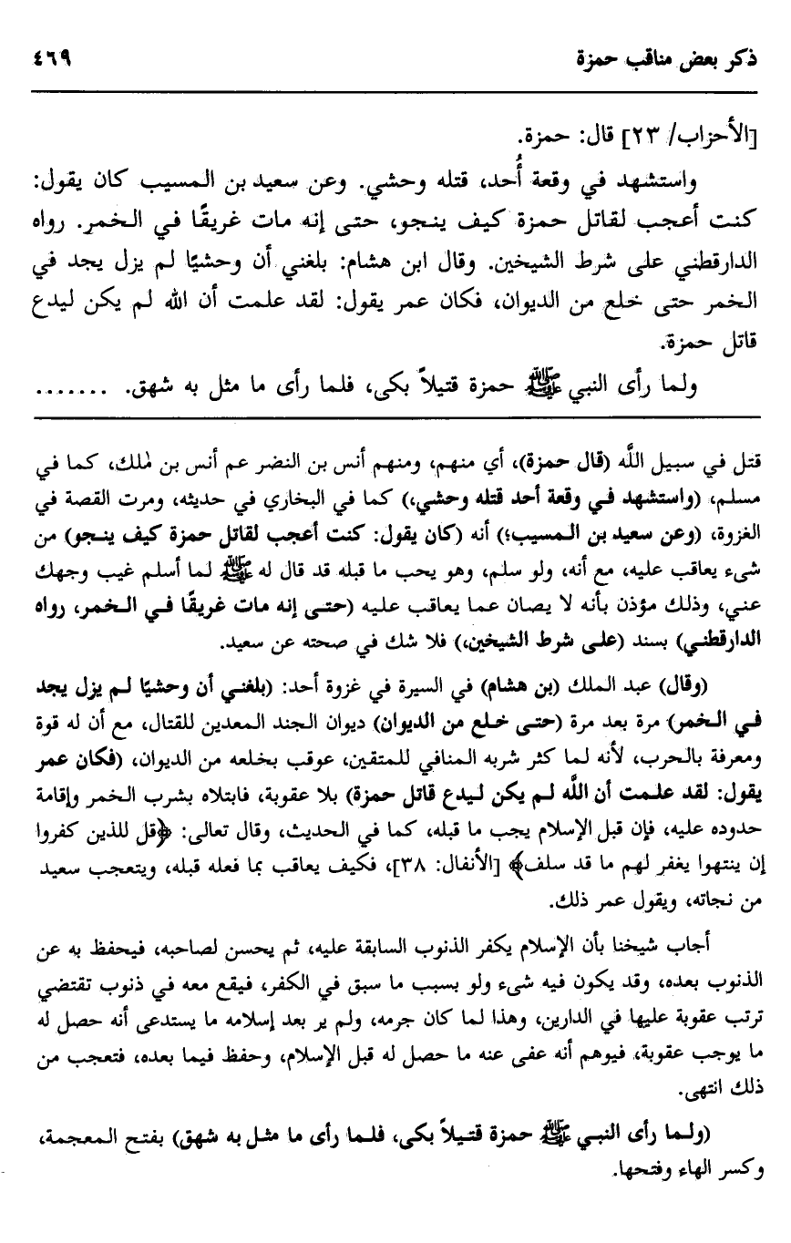 قتل في سبيل الله "قال حمزة" أي منهم، ومنهم أنس بن النضر عم أنس بن مالك، كما في مسلم "واستشهد في وقعة أحد قتله وحشي" كما في البخاري في حديثه، ومرت القصة في الغزوة، "وعن سعيد بن المسيبب" أنه "كان يقول: كنت أعجب لقاتل حمزة كيف ينجو" من شيء يعاقب عليه، مع أنه، ولو سلم، وهو يحب ما قبله قد قال له صلى الله عليه وسلم لما أسلم: "غيب وجهك عني"، وذلك مؤذن بأنه لا يصان عما يعاقب عليه "حتى إنه مات غريقا في الخمر، رواه الدارقطني"، بسند "على شرط الشيخين" فلا شك في صحته عن سعيد.