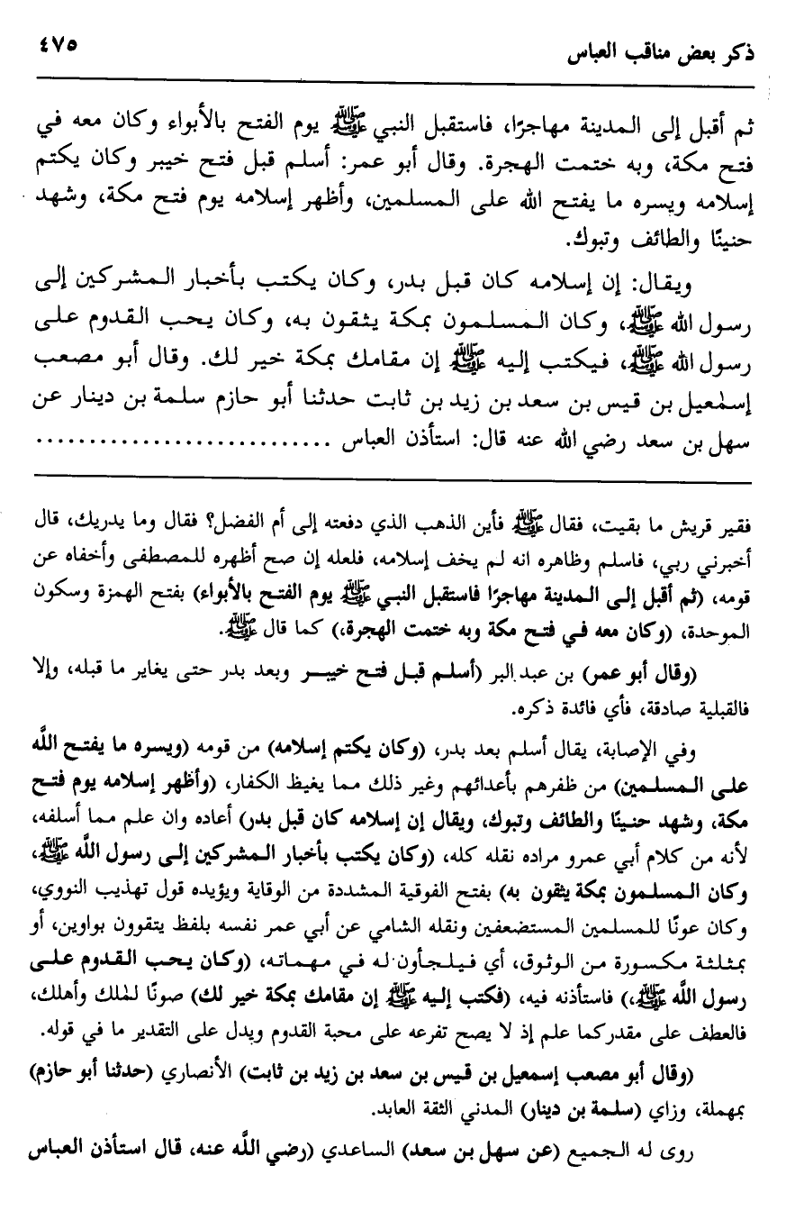 ويقال: إن إسلامه كان قبل بدر، وكان يكتب بأخبار المشركين إلى رسول الله صلى الله صلى الله عليه وسلم، وكان المسلمون بمكة يثقون به، وكان يحب القدوم على رسول الله صلى الله عليه وسلم، فيكتب إليه صلى الله عليه وسلم "إن مقامك بمكة خير لك". وقال أبو مصعب إسماعيل بن قيس بن سعد بن زيد بن ثابت حدثنا أبو حازم سلمة بن دينار عن سهل بن سعد رضي الله عنه قال: استأذن العباس