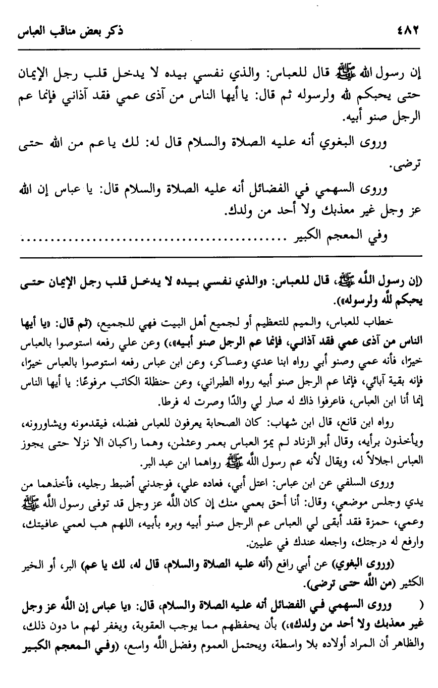 إن رسول الله صلى الله عليه وسلم قال للعباس: "والذي نفسي بيده لا يدخل قلب رجل الإيمان حتى يحبكم لله ولرسوله" ثم قال: "يا أيها الناس من آذى عمي فقد آذاني فإنما عم الرجل صنو أبيه".