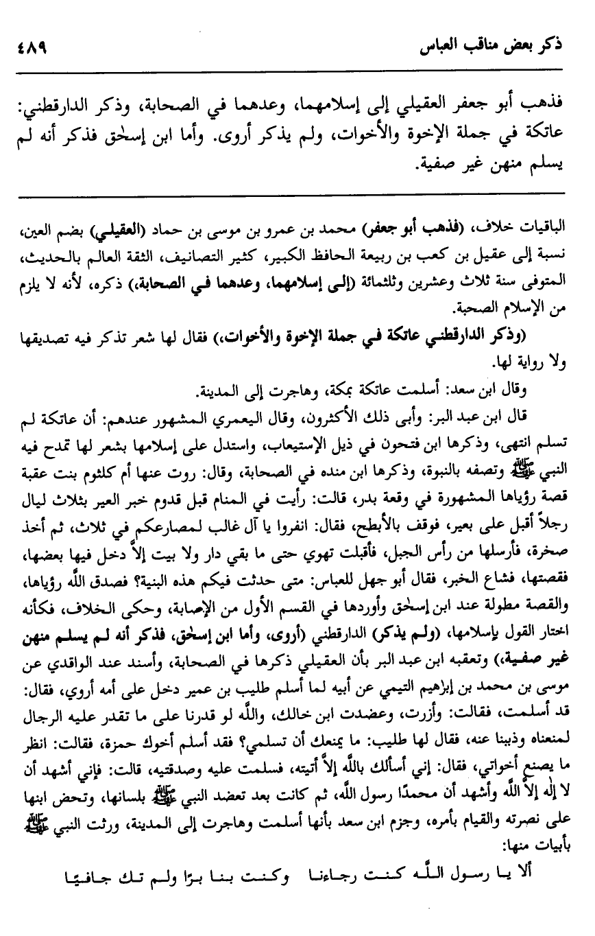 قال ابن عبد البر: وأبى ذلك الأكثرون، وقال اليعمري المشهور عندهم: أن عاتكة لم تسلم انتهى، وذكرها ابن فتحون في ذيل الاستيعاب، واستدل على إسلامها بشعر لها تمدح فيه النبي صلى الله عليه وسلم وتصفه بالنبوة وذكرها ابن منده في الصحابة، وقال: روت عنها أم كلثوم بنت عقبة قصة رؤياها المشهورة في وقعة بدر، قالت: رأيت في المنام قبل قدوم خبر العير بثلاث ليال رجلا أقبل على بعير، فوقف بالأبطح، فقال: انفروا يا آل غالب لمصارعكم في ثلاث، ثم أخذ صخرة، فأرسلها من رأس الجبل، فأقبلت تهوي حتى ما بقي دار ولا بيت إلا دخل فيها بعضها، فقصتها، فشاع الخبر، فقال أبو جهل للعباس: متى حدثت فيكم هذه البنية؟ فصدق الله رؤياها، والقصة مطولة عند ابن إسحاق وأوردها في القسم الأول من الإصابة، وحكى الخلاف، فكأنه اختار القول بإسلامها، "ولم يذكر" الدارقطني "أروى، وأما ابن إسحاق، فذكر أنه لم يسلم منهن غير صفية"، وتعقبه ابن عبد البر بأن العقيلي ذكرها ف الصحابة، وأسند عند الواقدي عن موسى بن محمد بن إبراهيم التيمي عن أبيه لما أسلم طليب بن عمير دخل على أمه أروى، فقال: قد أسلمت، فقالت: وأزرت وعضدت ابن خالك، والله لو قدرنا على ما تقدر عليه الرجال لمنعناه وذببنا عنه، فقال لها طليب: ما يمنعك أن تسلمي؟ فقد أسلم أخوك حمزة، فقالت: انظر ما يصنع أخواتي فقال: إني أسألك بالله إلا أتيته، فسلمت عليه وصدقتيه، قالت: فإني أشهد أن لا إله إلا الله وأشهد أن محمدا رسول الله، ثم كانت بعد تعضد النبي صلى الله عليه وسلم بلسانها، وتحض ابنها على نصرته والقيام بأمره، وجزم ابن سعد بأنها أسلمت وهاجرت إلى المدينة، ورثت النبي صلى الله عليه وسلم بأبيات منها: