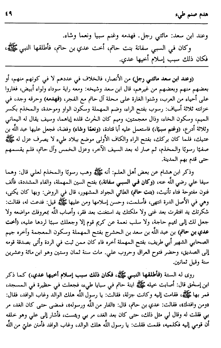 روى له الستة "فأطلقها النبي صلى الله عليه وسلم، فكان ذلك سبب إسلام أخيها عدي،" كما ذكر ابن إسحاق، قال: أصابت خيلة صلى الله عليه وسلم ابنة حاتم في سبايا طيء، فجعلت في حظيرة في المسجد، فمر بها صلى الله عليه وسلم، فقامت إليه وكانت جزلة، فقالت: يا رسول الله هلك الوالد وغاب الوافد، فقال: "ومن وافدك"، فقالت: عدي بن حاتم، قال: "الفار من الله ورسوله" فمضى حتى كان الغد، مر بي فقلت له وقال لي مثل ذلك، حتى كان بعد الغد، مر بي ويئست، فأشار إلى علي وهو خلفه أن قومي إليه فكلميه، فقمت فقلت: يا رسول الله هلك الوالد، وغاب الوافد فأمنن علي من الله