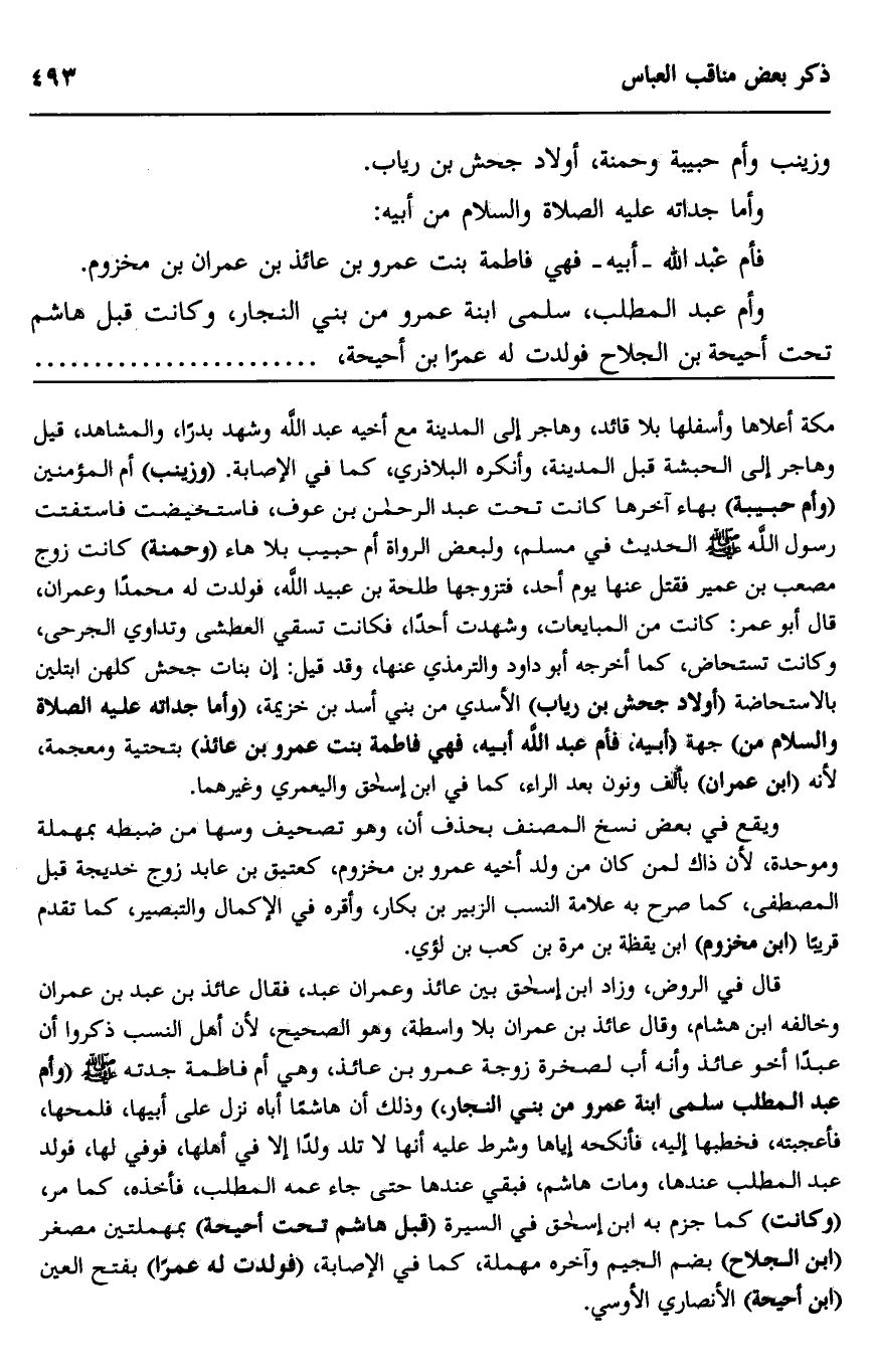 قال في الروض، وزاد ابن إسحاق بين عائذ وعمران عبد، فقال عائذ بن عبد بن عمران وخالفه ابن هشام، وقال عائذ بن عمران "بلا واسطة، وهو الصحيح؛ لأن أهل النسب ذكروا أن عبدا أخو عائذ وأنه أب لصخرة زوجة عمرو بن عائذ، وهي أم فاطمة جدته صلى الله عليه وسلم "وأم بد المطلب سلمى ابنة عمرو من بني النجار" وذلك أن هاشما أباه نزل على أبيها، فلمحها، فأعجبته فخطبها إليه، فأنكحه إياها وشرط عليه أنها لا تلد ولدا إلا في أهلها، فوفى لها، فولد عبد المطلب عندها، ومات هاشم، فبقي عندها حتى جاء عمه عبد المطلب، فأخذه، كما مر، "وكانت" كما جزم به ابن إسحاق في السيرة "قبل هاشم تحت أحيحة" بمهملتين مصغر "ابن الجلاح"، بضم الجيم وآخره مهملة، كما في الإصابة، "فولدت له عمرا" بفتح العين "ابن أحيحة" الأنصاري الأوسي.