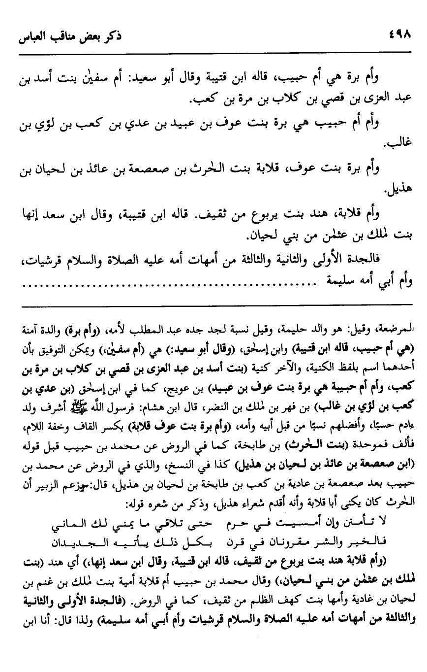 المرضعة، وقيل: هو والد حليمة، وقيل نسبة لجد جده عبد المطلب لأمه، "وأم برة" والدة آمنة "هي أم حبيب، قال ابن قتيبة" وابن إسحاق، "وقال أبو سعيد" هي "أم سفيان" ويمكن التوفيق بأن أحدهما اسم بلفظ الكنية، والآخر كنية "بنت أسد بن عبد العزي بن قصي بن كلاب بن مرة بن كعب، وأم أم حبيبة هي برة بنت عوف بن عبيد" بن عويج، كما في ابن إسحاق "بن عدي بن كعب بن لؤي بن غالب" بن فهر بن مالك بن النضر، قال ابن هشام: فرسول الله صلى الله عليه وسلم أشرف ولد آدم حسبا، وأفضلهم نسبا من قبل أبيه وأمه، وأم برة بنت عوف قلابة" بكسر القاف وخف اللام، فألف فموحدة "بنت الحارث" بن طابخة، كما في الروض عن محمد بن حبيب قبل قوله "ابن صعصعة بن عائذ بن عادية بن كعب بن طابخة بن لحيان بن هذيل" كذا في النسخ، والذي في الروض عن محمد بن حبيب بعد صعصعة بن عادية بن كعب بن طابخة بن لحيان بن هذيل، قال: وزعم الزبير أن الحارث كان يكنى أبا قلابة وأنه أقدم شعراء هذيل، وذكر من شعره قوله: