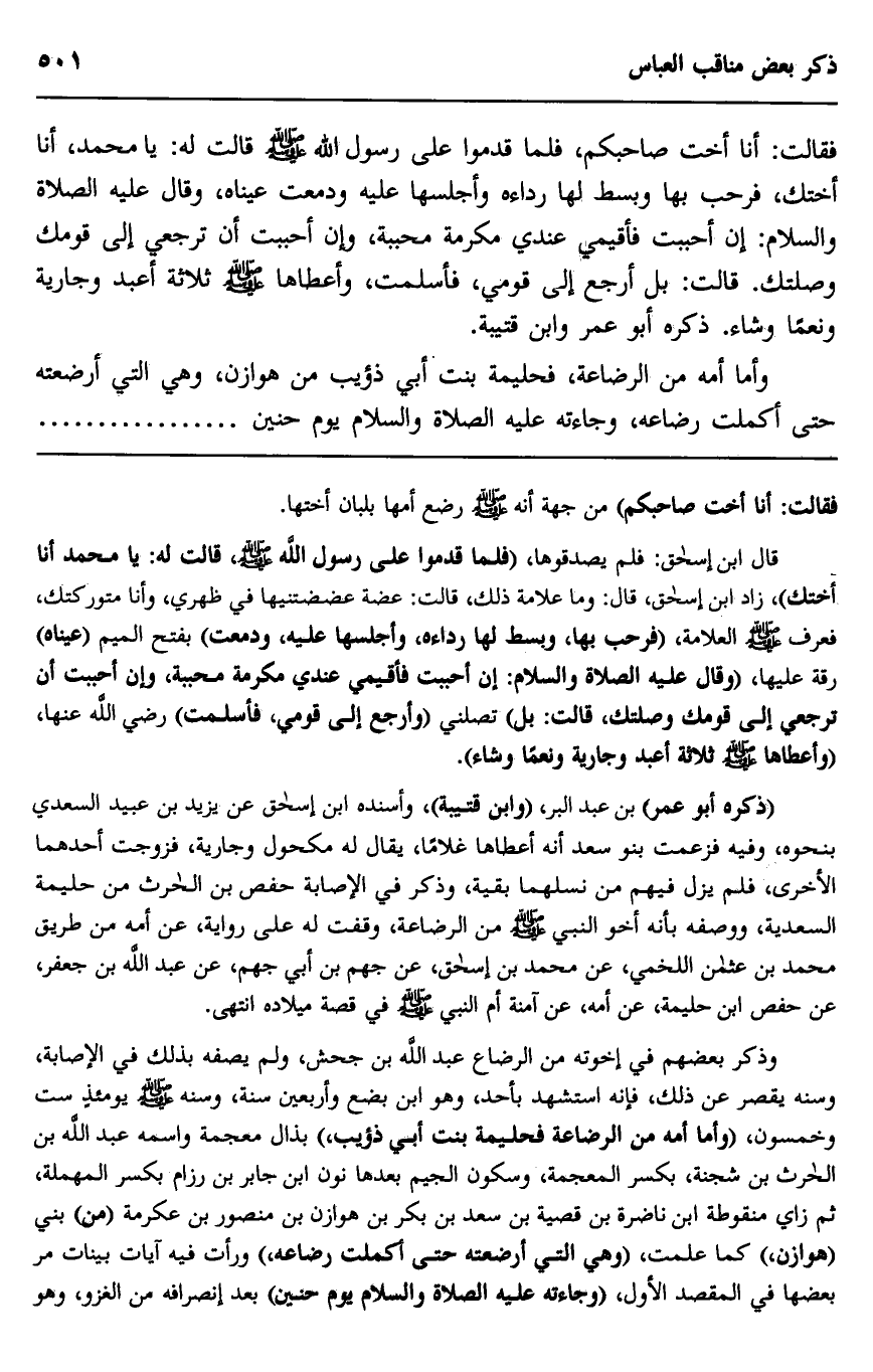 "ذكره أبو عمر" بن عبد البر، "وابن قتيبة" وأسنده ابن إسحاق عن يزيد بن عبيد السعدي بنحوه، وفيه فزعمت بنو سعد أنه أعطاها غلاما، يقال له مكحول وجارية، فزوجت أحدهما الأخرى، فلم يزل فيهم من نسلهما بقية، وذكر في الإصابة حفص بن الحارث من حليمة السعدية، ووصفه بأنه أخو النبي صلى الله عليه وسلم من الرضاعة، وقفت له عل رواية، عن أمه من طريق محمد بن عثمان اللخمي، عن محمد بن إسحاق، عن جهم بن أبي جهم، عن عبد الله بن جعفر، عن حفص بن حليمة، عن أمه، عن آمنة أم النبي صلى الله عليه وسلم في قصة ميلاده انتهى.