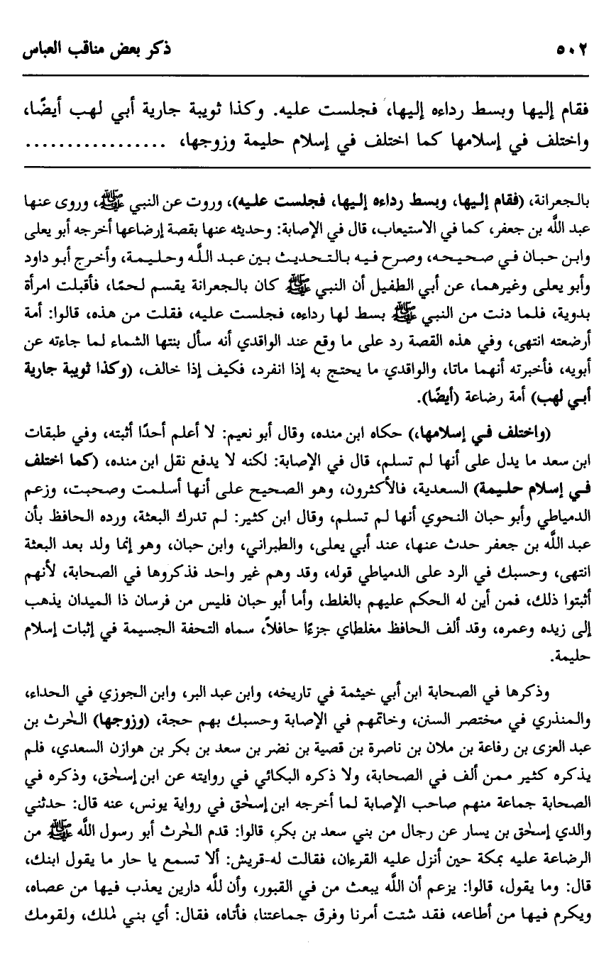فقال إليها وبسط رداءه إليها، فجلست عليه، وكذا ثوبية جارية أبي لهب أيضا، واختلف في إسلامها كما اختلف في إسلام حليمة وزوجها،