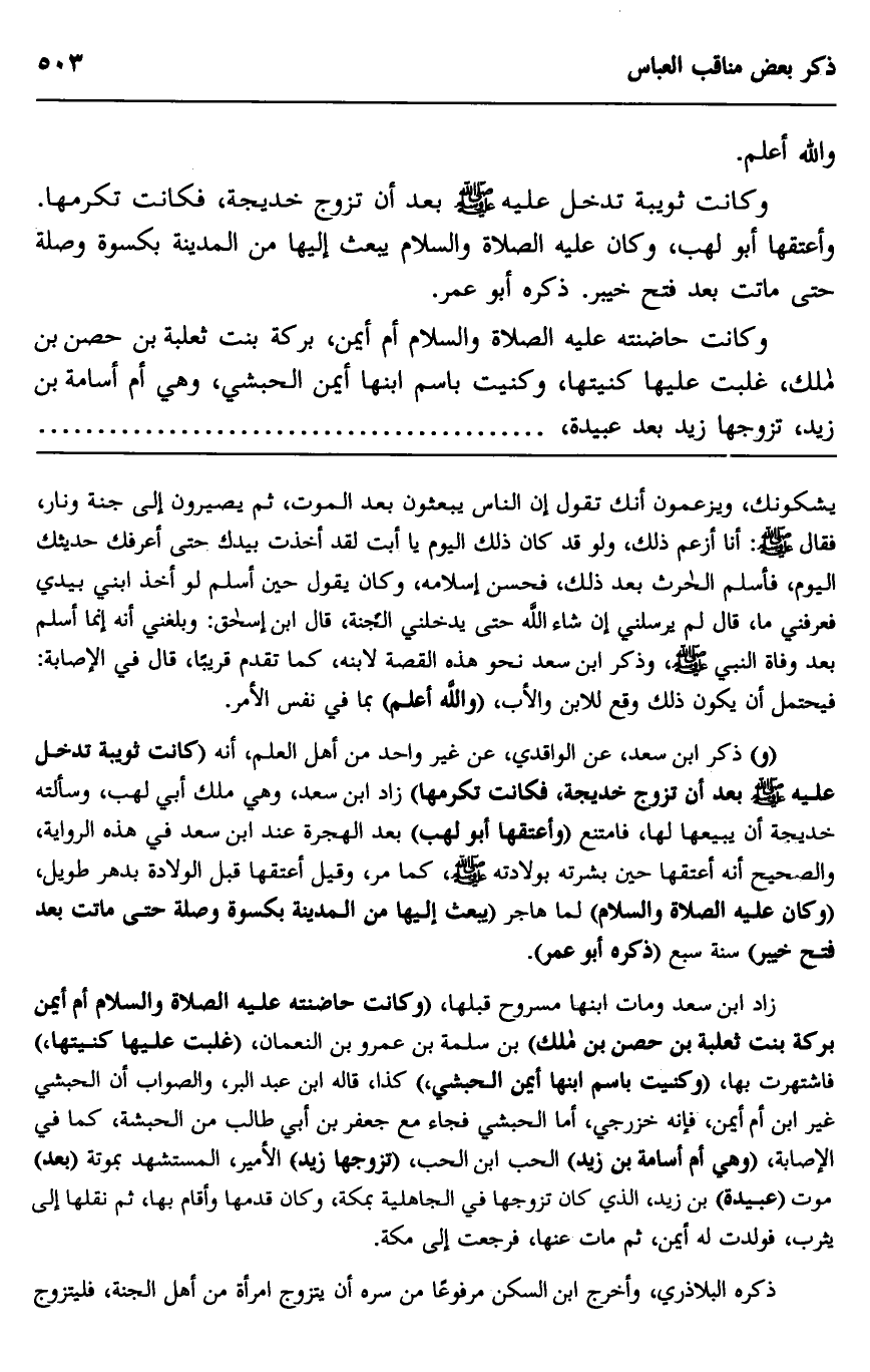 زاد ابن سعد ومات ابنها مسروح قبلها، "وكانت حاضنته عليه الصلاة والسلام أم أيمن بركة بنت ثعلبة بن حصن بن مالك" بن سلمة بن عمرو بن النعمان، "غلبت عليها كنيتها"، فاشتهرت بها، "وكنيت باسم ابنها أيمن الحبشي" كذا، قال ابن عبد البر، والصواب أن الحبشي غير ابن أم أيمن، فإنه خزرجي، أما الحبشي فجاء مع جعفر بن أبي طالب من الحبشة، كما في الإصابة، "وهي أم أسامة بن زيد" الحب ابن الحب، "تزوجها زيد" الأمير، المستشهد بموته "بعد" موت "عبيدة" بن زيد، الذي كان تزوجها في الجاهلية بمكة، وكان قدمها وأقام بها، ثم نقلها إلى يثرب، فولدت له أيمن، ثم مات عنها، فرجعت إلى مكة.