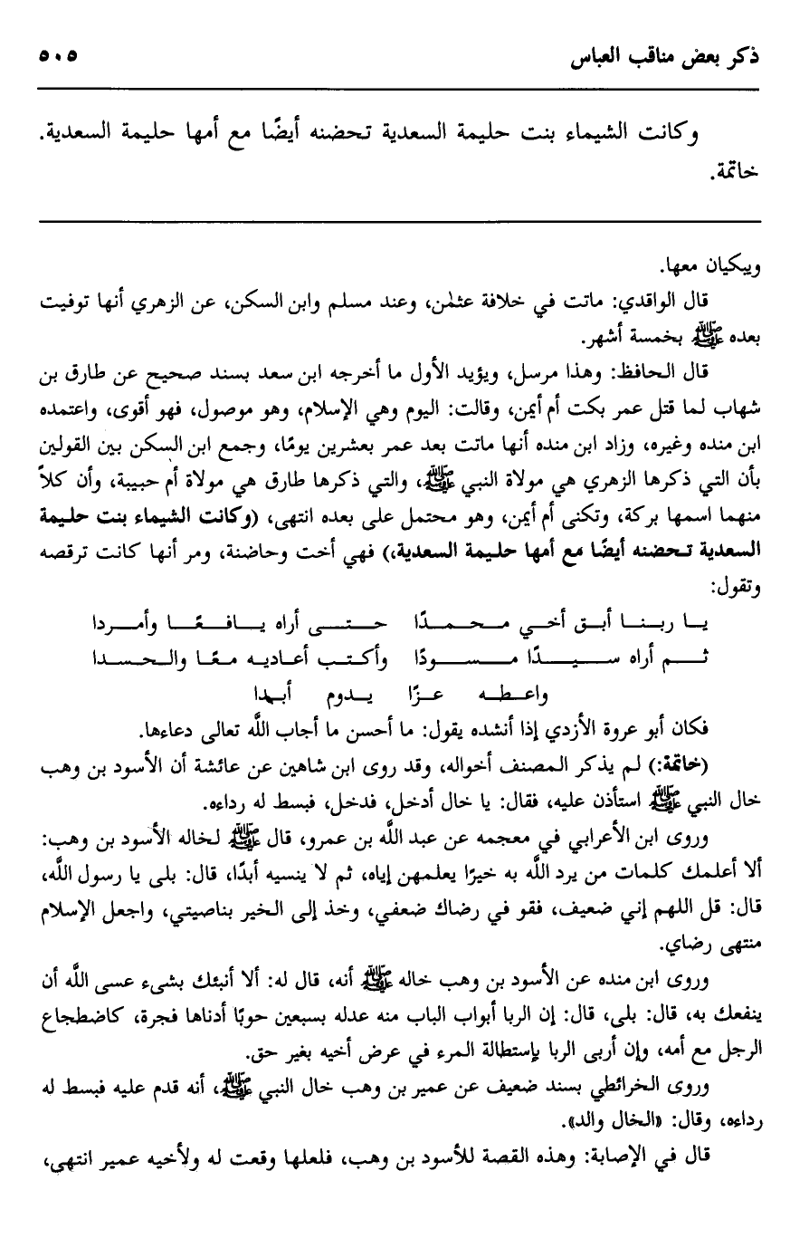 قال الحافظ: وهذا مرسل، ويؤيد الأول ما أخرجه ابن سعد بسند صحيح عن طارق بن شهاب لما قتل عمر بكت أم أيمن، وقالت: اليوم وهي الإسلام، وهو موصول، فهو أقوى، واعتمده ابن منده وغيره، وزاد ابن منده أنها ماتت بعد عمر بعشرين يوما، وجمع ابن السكن بين القولين، بأن التي ذكرها الزهري هي مولاة النبي صلى الله عليه وسلم، والتي ذكرها طارق هي مولاة أم حبيبة، وأن كلا منهما اسمها بركة، وتكنى أم أيمن، وهو محتمل على بعده انتهى، وكانت الشيماء بنت حليمة السعدية تحضنه أيضا مع أمها حليمة السعدية، فهي أخت وحاضنة ومر أنها كانت ترقصه وتقول: