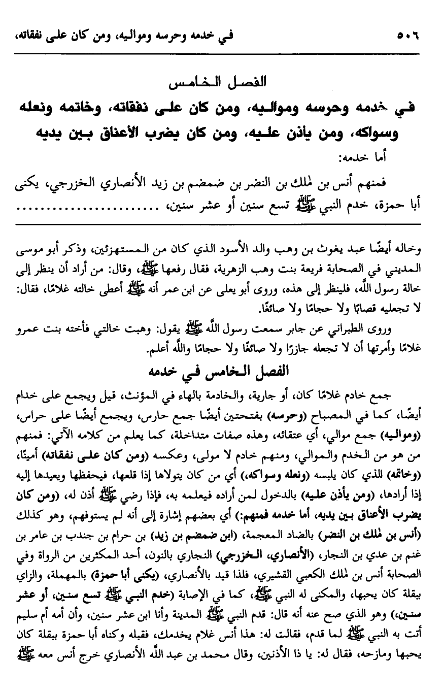 الفصل الخامس: في خدمه وحرسه ومواليه، ومن كان على نفقاته، وخاتمه ونعله وسواكه ومن يأذن عليه ومن كان يضرب الأعناق بين يديه