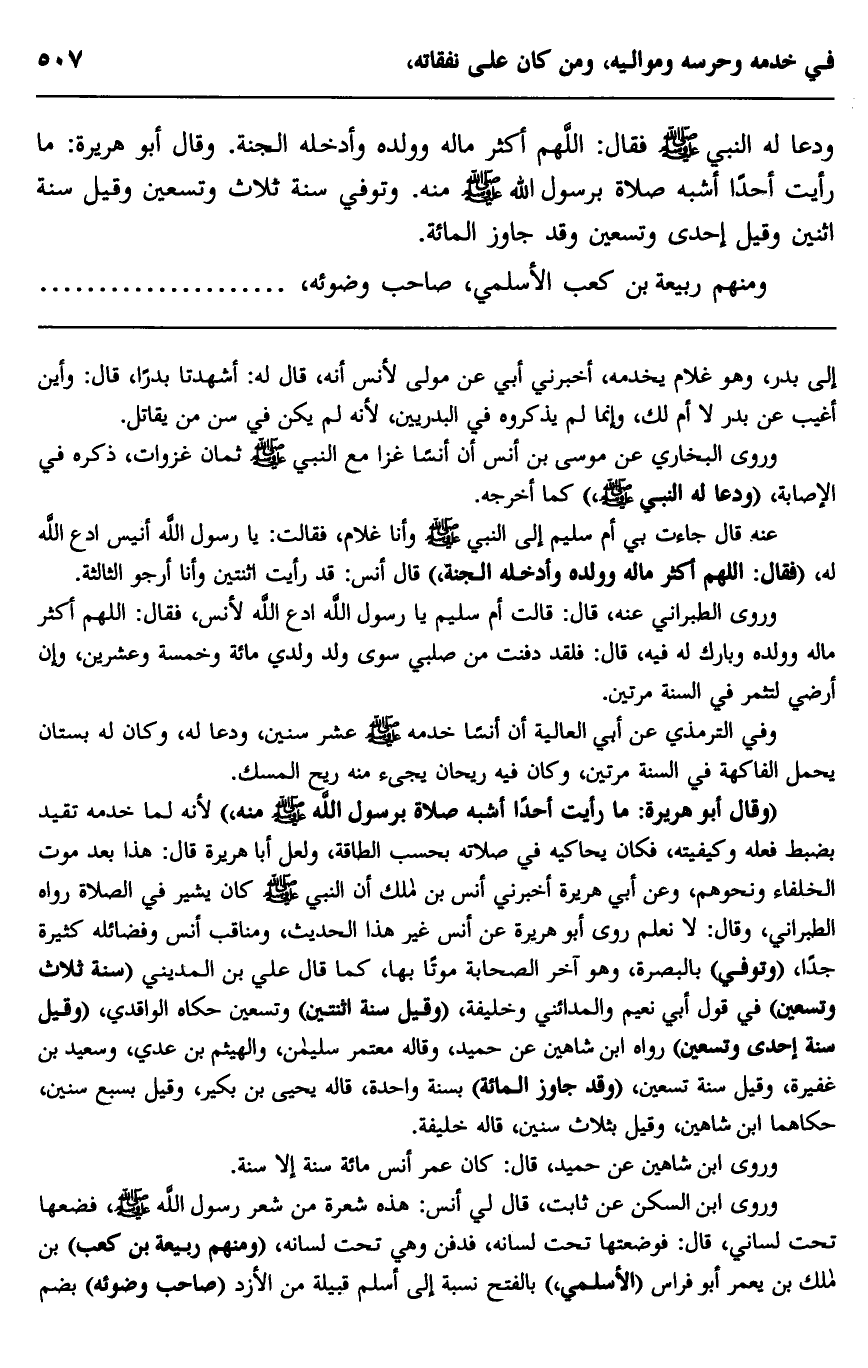 وروى ابن السكن عن ثابت قال لي أنس: هذه شعرة من شعر رسول الله صلى الله عليه وسلم فضعها تحت لساني، قال: فوضعتها تحت لسانه، فدفن وهي تحت لسانه، "ومنهم ربيعة بن كعب"، بن مالك بن يعمر أبو فراس "الأسلمي" بالفتح نسبة إلى أسلم قبيلة من الأزد "صاحب وضوئه" بضم