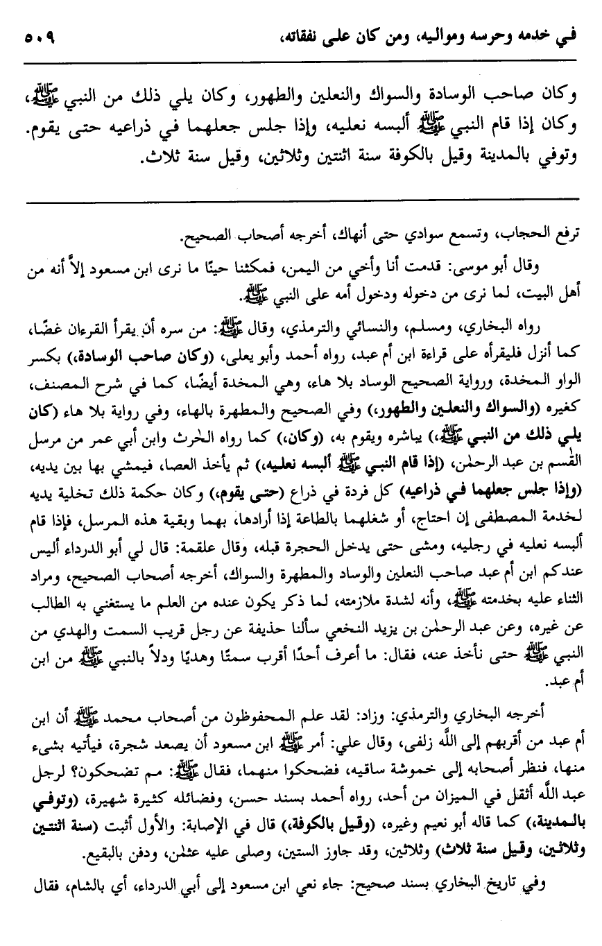 أخرجه البخاري والترمذي: وزاد: لقد علم المحفوظون من أصحاب محمد صلى الله عليه وسلم أن ابن أم عبد من أقربهم إلى الله زلفى، وقال علي: أمر صلى الله عليه وسلم ابن مسعود أن يصعد شجرة، فيأتيه بشيء منها، فنظر أصحابه إلى خموشة ساقيه، فضحكوا منهما، فقال صلى الله عليه وسلم: "مم تضحكون؟ لرِجل عبد الله أثقل في الميزان من أحد"، رواه أحمد بسند حسن، وفضائله كثيرة شهيرة، "وتوفي بالمدينة" كما قاله أبو نعيم وغيره، "وقيل بالكوفة" قال في الإصابة: والأول أثبت "سنة اثنتين وثلاثين وقيل سنة ثلاث" وثلاثين، وقد جاوز الستين وصلى عليه عثمان، ودفن بالبقيع.